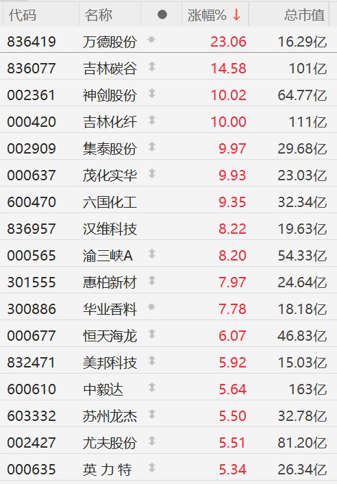 格隆汇5月15日|A股市场化工股集体走强,其中,万德股份涨23%,吉林碳谷涨超14%,神剑股份(002361)、吉林化纤(000420)、集泰股份(002909)、茂化实华(000637)涨停,六国化工(600470)逼近涨停,汉维科技、渝三峡A涨超8%,惠柏新材、华业香料涨超7%,恒天海龙(000677)涨6%,美邦科技、中毅达、苏州龙杰(603332)、尤夫股份、英力特(000635)涨超5%。消息面上,受低空经济拉动,无人机需求增加,吉林化纤旗下的湿法3k碳纤维供不应求,各牌号产品每吨分别上涨10000元。