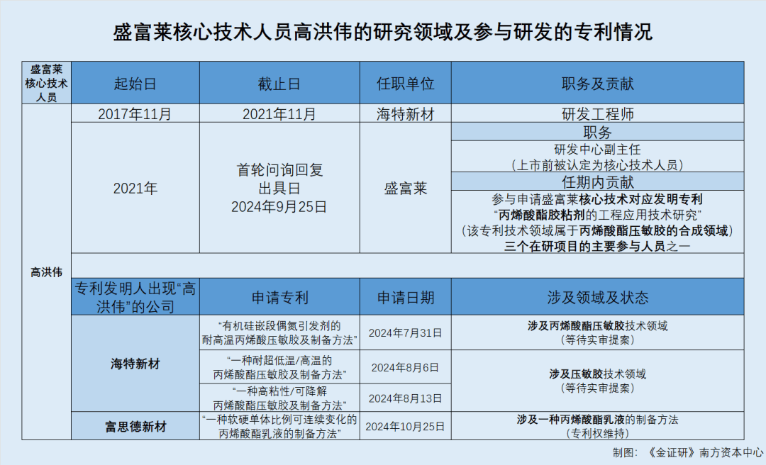 《金证研》南方资本中心 望山DL/作者 西洲 映蔚/风控 2025年3月26日,证监会对《上市公司信息披露管理办法》进行了修订。主要修订内容包括强化风险揭示要求,上市公司应当充分披露可能对公司核心竞争力、经营活动和未来发展产生重大不利影响的风险因素。 在此背景下,冲击北交所的江西盛富莱光学科技股份有限公司(以下简称“盛富莱”),其核心技术人员高洪伟,自2021年起入职盛富莱并担任研发中心副主任。然而在高洪伟在盛富莱任职期间,其“老东家”在2024年申请的专利中,也出现名为“高洪伟”的专利发明人,且相关专利与高洪伟在盛富莱从事的主要研究领域或存重叠。另一方面,关于盛富莱主要产品之一微棱镜型反光膜的产能数据,或低于环评披露的数据,信息披露现疑云。 一、核心技术人员高洪伟“老东家”专利发明人现其身影,相关领域与高洪伟在盛富莱从事的研究领域或存重叠 对于拟上市公司而言,若存在核心技术人员对外兼职,监管机构将重点关注核心技术人员对外兼职发挥的实际作用,是否和拟上市企业属于同行业以及公司技术来源的合法合规性。 对于盛富莱,其核心技术人员高洪伟是盛富莱研发中心副主任。令人费解的是,2024年,高洪伟“老东家”或一家第三方企业,在2024年申请的专利的发明人中,也包括名为高洪伟的人员,且相关专利与高洪伟任职于盛富莱从事的研究领域或存重叠。 1.1 研发中心副主任高洪伟被认定为核心技术人员,参与核心技术对应专利 据盛富莱签署日为2023年12月21日的招股说明书(以下简称“2023年12月21日的招股书”),此次上市前,高洪伟系盛富莱核心技术人员之一。2017年11月至2021年11月,高洪伟就职于无锡海特新材料研究院有限公司(以下简称“海特新材”),担任研发工程师;2021年起,高洪伟均担任盛富莱研发中心副主任。 截至2023年6月30日,盛富莱共计14个在研项目,其中“丙烯酸酯胶粘剂的工程应用技术研究”等3个在研项目的主要参与人员均包括高洪伟。 据出具日为2024年9月25日的《关于江西盛富莱光学科技股份有限公司公开发行股票并在北交所上市申报文件的审核问询函之回复》(以下简称“2024年9月25日首轮问询回复”),盛富莱的核心技术包括微棱镜型反光膜制造技术,该核心技术涉及的相关专利包含“一种高分子量溶剂型丙烯酸酯压敏胶及其制备方法”。 据国家知识产权局,专利“一种高分子量溶剂型丙烯酸酯压敏胶及其制备方法”,专利类型为发明专利,专利权人为盛富莱,发明人为高洪伟、马展辉、白永平、陈欧波、章翟,申请日期为2022年4月13日。截至查询日2025年5月16日,该专利处于专利权维持状态。 显然,高洪伟任职盛富莱期间,作为发明人之一,为其核心技术“微棱镜型反光膜制造技术”贡献了对应专利。 据2024年9月25日首轮问询回复,2021-2023年及2024年1-6月,盛富莱的核心技术产品微棱镜型反光膜存在部分合作研发核心技术,该产品销售金额占各期主营业务收入的比例分别为21.45%、22.9%、25.4%、20.84%。 然而,高洪伟任职盛富莱期间,或现身“前东家”的专利申请的发明人名单。 1.2 高洪伟现身“前东家”及其他企业2024年申请的专利发明人名单,且相关领域或存重叠 据2023年12月21日招股书,高洪伟研究领域涉及功能聚酯膜材料研究,高性能丙烯酸酯压敏胶合成,功能高分子材料的合成、改性及加工等。高洪伟作为主要参与人员之一,参与的盛富莱在研项目“丙烯酸酯胶粘剂的工程应用技术研究”,拟达到的目标为解决丙烯酸酯胶粘剂在微棱镜型反光膜领域的工程应用技术难题等。 且据国家知识产权局,发明专利“一种高分子量溶剂型丙烯酸酯压敏胶及其制备方法”,其技术领域属于丙烯酸酯压敏胶的合成领域,目的是针对现有技术中压敏胶多种性能难以兼顾的问题,提供一种兼具高初粘力、高剥离力、高保持力的丙烯酸酯压敏胶。 研究发现,高洪伟“前东家”海特新材2024年申请的专利中,却现高洪伟的“身影”。 据国家知识产权局,“有机硅嵌段偶氮引发剂的耐高温丙烯酸压敏胶及制备方法”、“一种耐超低温/高温的丙烯酸酯压敏胶及制备方法”、“一种高粘性/可降解丙烯酸酯压敏胶及制备方法”三项专利,专利类型均为发明专利,申请人均为海特新材,发明人均为谢雨欣、白永平、高洪伟、龙军、孙世皓,申请日期分别为2024年7月31日、2024年8月6日、2024年8月13日。截至查询日2025年5月16日,上述三项专利的法律状态均处于等待实审提案。 其中“有机硅嵌段偶氮引发剂的耐高温丙烯酸压敏胶及制备方法”属于丙烯酸酯压敏胶技术领域,目的系解决常用技术存在的耐高温性、粘结性能差的问题。 “一种耐超低温/高温的丙烯酸酯压敏胶及制备方法”涉及压敏胶技术领域,解决常用技术形成的在高温、低温条件下容易出现脱粘的的问题。本发明通过使用异山梨醇作为交联剂构建高粘性和高内聚力的网络体系,在极端温度条件下仍能保持粘接性能,适用于从超低温到高温的各种环境。 “一种高粘性/可降解丙烯酸酯压敏胶及制备方法”涉及压敏胶技术领域,解决常用技术形成可降解无法兼顾性能的问题。本发明制备的丙烯酸酯压敏胶其性能稳定,能够长时间保持粘性,不易脱落或失效,提高了产品的耐用性和可靠性。 不仅如此,据国家知识产权局,专利“一种软硬单体比例可连续变化的丙烯