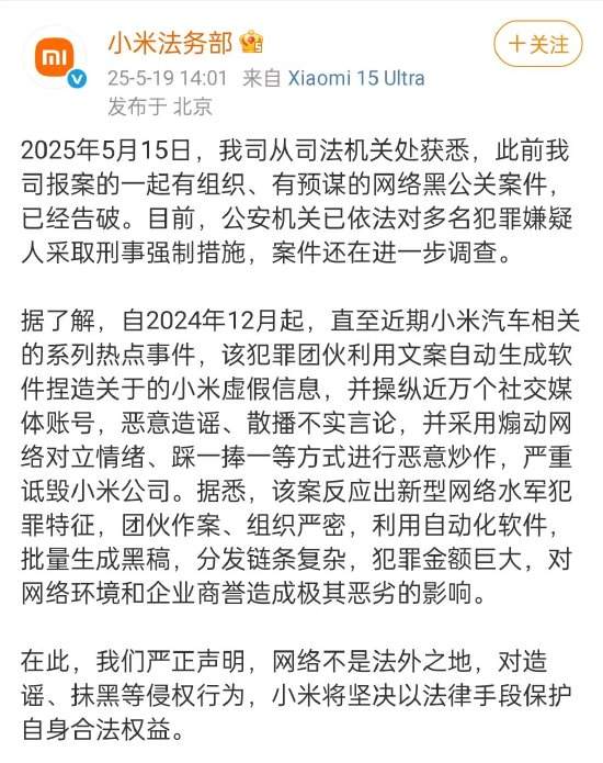 5月19日下午消息,小米法务部通过官方微博发布信息表示,5月15日从司法机关处获悉,此前报案的一起有组织、有预谋的网络黑公关案件,已经告破。目前,公安机关已依法对多名犯罪嫌疑人采取刑事强制措施,案件还在进一步调查。 小米法务部称,据了解,自2024年12月起,直至近期小米汽车相关的系列热点事件,该犯罪团伙利用文案自动生成软件捏造关于的小米虚假信息,并操纵近万个社交媒体账号,恶意造谣、散播不实言论,并采用煽动网络对立情绪、踩一捧一等方式进行恶意炒作,严重诋毁小米公司。据悉,该案反应出新型网络水军犯罪特征,团伙作案、组织严密,利用自动化软件,批量生成黑稿,分发链条复杂,犯罪金额巨大,对网络环境和企业商誉造成极其恶劣的影响。 小米法务部强调,网络不是法外之地,对造谣、抹黑等侵权行为,小米将坚决以法律手段保护自身合法权益。