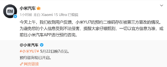 5月19日下午消息,小米汽车在官方微博发文称,“今天上午,我们收到用户反馈,小米YU7的预约二维码存在被第三方篡改的情况。为避免您的个人信息受到不法侵害,提醒大家仔细甄别,一切以官方信息为准,或前往小米汽车APP进行预约咨询”。 责任编辑:何俊熹 (责任编辑:郭健东 )