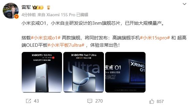 【大河财立方消息】5月20日,雷军在社交媒体上宣布,小米玄戒O1,小米自主研发设计的3nm旗舰芯片,已开始大规模量产。 雷军同时宣布,两款搭载小米玄戒O1的旗舰产品小米15spro和小米平板7ultra将同时发布。 此前,5月19日,雷军发文称,截至今年4月底,玄戒累计研发投入已经超过了135亿元人民币,目前,研发团队已经超过了2500人,今年预计的研发投入将超过60亿元。 责编:李文玉 | 审核:李震 | 监审:古筝 (责任编辑:张晓波 )