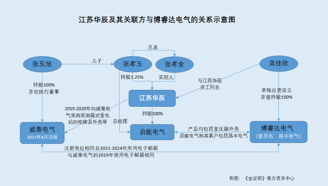 《金证研》南方资本中心 罗九/作者 映蔚/风控 2025年4月28日,江苏华辰变压器股份有限公司(以下简称“江苏华辰”)公布了其2024年报及2025年一季度报告。其中,2024年及2025年一季度,江苏华辰归属于上市公司股东的净利润同比增速均告负,分别为-24.58%、-10.57%。 此番拟发行可转债,江苏华辰拟扩充箱式变电站等产品产能背后,其前次募投项目产品箱式变电站产能利用率未饱和,且效益未达预期。而此番再融资在被问询项目效益时,江苏华辰或选择性披露同行可比项目的建筑面积,单位产值现疑云。此外,一家第三方企业使用的邮箱系江苏华辰已注销关联供应商的曾用邮箱,该第三方企业的原全资股东吴佳欣与江苏华辰2025年披露的获股权激励员工“同名”,且江苏华辰子公司官网披露的主要客户,与该第三方企业的曾用公司名称“同名”。值得注意的是,江苏华辰置入标的两天后称其拥有三级电力资质,标的被置入前现零人异象且净资产仅百万余元。 一、产能利用率未饱和再融资扩产,同行可比项目的建筑面积或选择性披露单位产值现疑云 继首次公开发行募投项目后,江苏华辰2024年拟发行可转债继续扩产箱式变电站的产能。而江苏华辰的首发募投项目截至2024年产能利用率不足七成,且2024年上半年的净利润未达预期。在此背景下,江苏华辰此番拟发行可转债的募投项目效益遭问询,蹊跷的是,关于同行企业可比项目的建筑面积信披现疑云。 1.1 2024年拟通过发行可转债扩充箱式变电站等产品产能,投产后箱式变电站产能将“翻倍” 2025年5月13日收盘后,江苏华辰发布公告称,其向不特定对象发行可转换公司债券的注册,获得证监会批复。 据签署日期为2024年12月20日的江苏华辰向不特定对象发行可转换公司债券募集说明书(以下简称“签署于2024年12月20日的可转债募集书”),江苏华辰拟发行可转换公司债券拟募集资金4.6亿元,用于“新能源电力装备智能制造产业基地建设项目(一期)”(以下简称“产业基地一期”)、“新能源电力装备数字化工厂建设项目”(以下简称“数字化工厂项目”)、“补充流动资金”。 其中,“产业基地一期”投资总额为5.44亿元,拟使用募集资金2.69亿元,将新增新能源干式变压器产能1,056万kVA/年、新能源油浸式变压器产能1,584万kVA/年、新能源箱式变电站产能3,360台/年。 据签署日期为2024年12月20日的《关于江苏华辰向不特定对象发行可转换公司债券申请文件的审核问询函的回复》(以下简称“可转债问询回复”),截至2024年6月,江苏华辰的箱式变电站产能为2,411台/年,前次募投项目全部建成后,箱式变电站产能为2,411台/年,本次募投项目实施后,箱式变电站预计产能为5,771台/年。 即此次可转债发行后,江苏华辰的箱式变电站产能将翻倍。 1.2 首发募投项目亦扩充箱式变电站产能,2024年产能利用率不足七成上半年净利润指标未达预期 据江苏华辰签署日期为2022年4月27日的招股说明书(以下简称“签署于2022年4月27日的招股书”),2019-2021年,江苏华辰的箱式变电站年产能均为600台。 值得注意的的是,首发时,江苏华辰拟募集资金调整为2.68亿元,拟投入于节能环保输配电设备智能化生产技改项目(以下简称“变压器技改项目”)、新能源智能箱式变电站及电气成套设备项目(以下简称“箱变及成套设备项目”)、技研中心及营销网络建设项目。 其中,“箱变及成套设备项目”的原计划投资总额为2.86亿元,调整后为2.12亿元,项目实施后预计新增新能源智能箱式变电站产能2,500台,新增智能电气成套设备产能6,000台。 即首发募投项目箱变及成套设备项目建成前,江苏华辰的箱式变电站年产能为600台,其首发募投项目拟新增箱式变电站产能2,500台。 截至2024年4月9日,江苏华辰“箱变及成套设备项目”已达到预定可使用状态,并进行结项。2021-2023年及2024年1-6月,江苏华辰的箱式变电站的产能分别为600台、600台、2,411台、1,205台。 此外,前次募投项目即首发募投项目全部建成后,江苏华辰箱式变电站的年产能为2,411台,截至2024年6月,江苏华辰的箱式变电站年化产能为2,411台。 据签署日期为2025年2月21日的《关于江苏华辰向不特定对象发行可转换公司债券的审核中心意见落实函的回复》(以下简称“可转债审核意见落实函”),因“箱变及成套设备项目”中新能源智能箱式变电站生产主体部分于2023年已基本完成,导致自2023年起江苏华辰箱式变电站的产能由2022年度的600台增加至2023年的2,411台。 其中,江苏华辰表示,“箱变及成套设备项目”的备案产能、设计达产的产能为2,411台。 也就是说,首发上市时招股书披露其募投项目“箱变及成套设备项目”拟新增箱式变电站产能2,500台。而建设前,江苏华辰箱式变电站的产能为600台。而此次再融资,江苏华辰称前次募投项目“箱变及成套设备项目”设计产能为2,411台,项目投产后江苏华辰的箱式变电站产能为2,411台,个中差异令人费解。 需要指出的是,据可转债问询回复,2021-2023年及2024年1-6月,江苏华辰的箱式变电站的产能分别为600台、600台、2,411台、1,205台,产能利用率分别为134.17%、99.17%、60.64%、57.01%。 在可转债问询中,上交所要求江苏华辰说明,“箱变及成套设备项目”2024年1-6月实际效益及产能利用率较低的原因及合理性。 对此,江苏华辰表示,2024年1-6月,“箱变及成套设备项目”的拟建产品变电站、电气成套设备的产能利用率