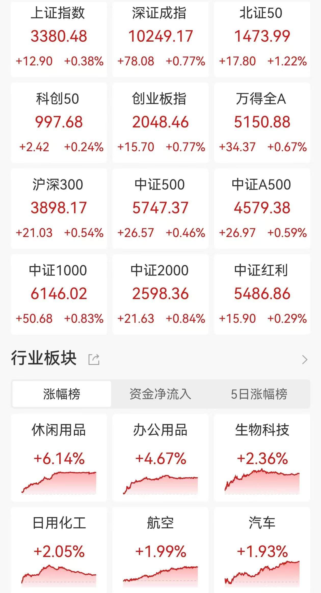 格隆汇5月20日|A股主要指数今日震荡上行,截至收盘,沪指涨0.38%报3380点,深证成指涨0.77%,创业板指涨0.77%,北证50指数涨1.22%创历史新高。全天成交1.21万亿元,较前一交易日增量923亿元,全市场超3800股上涨。 盘面上,宠物经济板块持续爆发,创源股份涨停;盲盒经济、谷子经济板块走高,奥飞股份等多股涨停;培育钻石板块拉升,曼卡龙20%涨停;家用轻工板块走强,广博股份(002103)等多股涨停;美容护理、人造肉及珠宝首饰等板块涨幅居前。另外,航运港口板块下挫,凤凰航运、连云港(601008)等多股跌停;PEEK材料板块走低,中欣氟材(002915)跌超9%;航天航空板块走弱,中航成飞跌近8%;碳纤维、可控核聚变及钛白粉等板块跌幅居前。(格隆汇) (责任编辑:宋政 HN002)