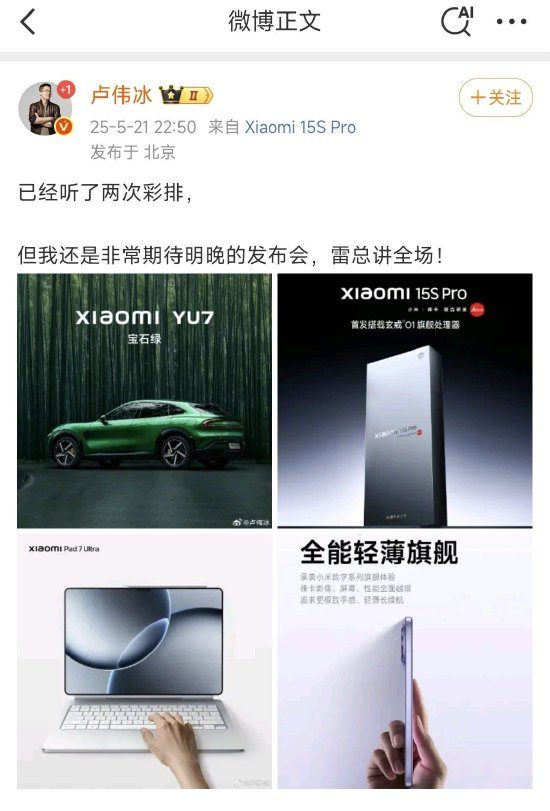 仟茂科技讯 5月22日下午消息,日前小米集团合伙人、总裁,手机部总裁,小米品牌总经理卢伟冰发布微博“剧透”即将举行的小米发布会多个爆点:“今晚发布会前最后一次彩排,可以透露的是: 玄戒芯片不止O1一款。” 另外,他还表示雷军将讲全场,“已经听了两次彩排,但我还是非常期待明晚的发布会,雷总讲全场! ” 据悉,5月22日19:00将举行小米15周年发布会,会上将发布包括小米自主研发设计的全新旗舰处理器“玄戒O1”、全新旗舰小米15S Pro与小米平板7 Ultra、全新小米 YU7在内的多款新品。(张奥) 责任编辑:杨赐 (责任编辑:张晓波 )
