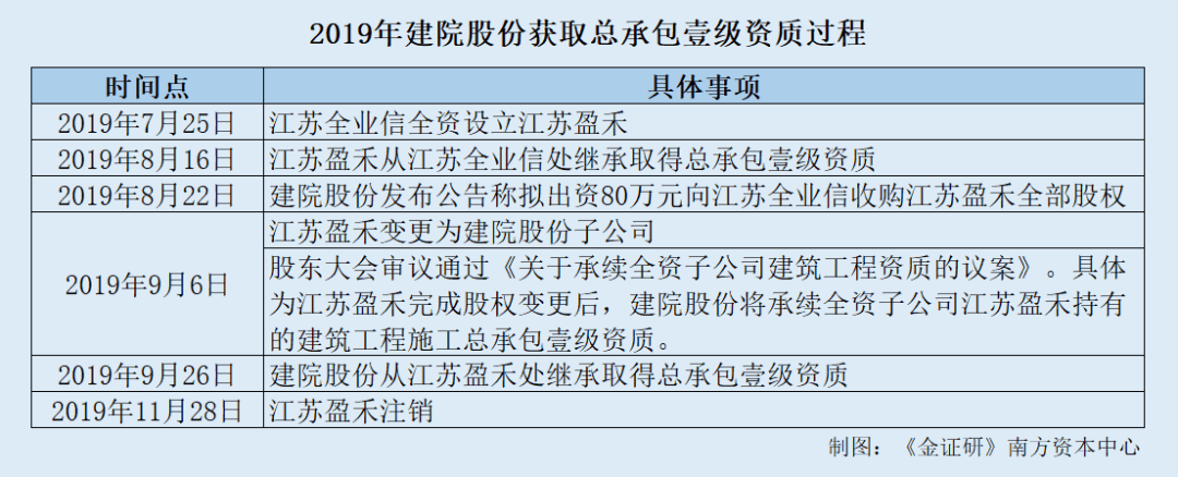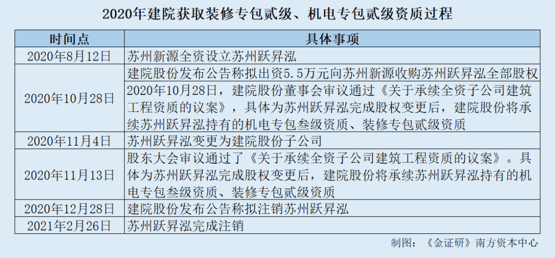 据2024年6月24日签署的招股书及2024年12月7日签署的首轮问询回复,2021-2023年及2024年1-6月,建院股份苏州地区的业务收入分别为10.61亿元、8.04亿元、12.66亿元、7.4亿元,占主营业务收入的比例分别为76.02%、66.88%、89.46%、93.36%。 不难发现,建院股份超半数收入来自苏州市地区。 而与此同时,2021-2023年及2024年1-6月,建院股份房地产项目的收入分别为6.54亿元、3.59亿元、4.7亿元、2.01亿元,占主营业务收入的比例分别为46.86%、29.87%、33.21%、25.3%。 由此可见,2021-2023年及2024年1-6月,建院股份房地产项目收入占比超两成。 值得关注的是,据苏州市统计局发布的数据,2020-2023年,苏州市房地产开发投资的金额分别为2,673.7亿元、2,869.8亿元、2,691.4亿元、2,591.9亿元。同期分别同比增长-0.5%、7.3%、-6.2%、-3.7%。 即2022-2023年,苏州市房地产开发投资金额均下滑。 综上而言,2022-2024年,建院股份的地基基础服务业务收入均不及2021年。而在2020年,建院股份开始承接总承包业务累计创收超18亿元。并且,建院股份业务区域主要集中在苏州市,且超两成收入来自房地产项目,而苏州市房地产开发投资自2022年以来连续两年下滑。基于上述情形,建院股份未来成长能力或待关注。 二、标的成立不足半年即被置入获取资质,交易后两家标的随即注销 企业经营需合法合规。回溯历史,建院股份曾数次通过收购子公司来获得专业资质,其中两家标的在被收购前成立不足半年时间,且被置入建院股份后,两家标的相继注销。除此之外,建院股份仅一家子公司拥有专业资质,而该子公司也是收购而来,交易对手方系一家建筑资质服机构。 2.1 2019年收购江苏盈禾后即继承其总承包资质,并于同年注销江苏盈禾 前述提到,建院股份于2020年开始承接总承包业务,并于2021年正式成立总承包事业部。 据2024年6月24日签署的招股书,根据《建筑业企业资质管理规定》等相关法律法规的规定,总承包企业必须具有总承包资质。而截至招股书签署日2024年6月24日,建院股份取得的建筑工程施工总承包壹级资质(以下简称“总承包壹级资质”)证书编号为D132135603,资质证书有效期为2028年12月22日。 研究发现,该资质系建院股份于2019年通过股权收购取得。 据全国建筑市场监管公共服务平台公开信息,建院股份持有的编号为D132135603的总承包壹级资质证书备注信息显示,江苏盈禾建设有限公司(以下简称“江苏盈禾”)是建院股份的全资子公司,其持有的建筑工程施工总承包壹级资质已注销。并且,该资质平移给建院股份。 进一步研究江苏盈禾的情况。 据建院股份公开信息、住建部及市场监督管理局数据,2019年7月25日,江苏盈禾成立,成立时由江苏全业信建设有限公司(以下简称“江苏全业信”)全资持有。2019年8月16日,江苏盈禾从江苏全业信处继承取得总承包壹级资质。 2019年8月22日,建院股份发布公告称拟出资80万元向江苏全业收购江苏盈禾全部股权。2019年9月6日,江苏盈禾工商登记的股权结构由江苏全业信变更为由建院股份全资持有。 同日即2019年9月6日,建院股份召开股东大会审议通过《关于承续全资子公司建筑工程资质的议案》。具体为江苏盈禾完成股权变更后,建院股份将承续全资子公司江苏盈禾持有的建筑工程施工总承包壹级资质。 2019年9月26日,建院股份通过从江苏盈禾处继承取得总承包壹级资质。2019年11月28日,江苏盈禾注销。 即江苏盈禾从设立到注销不足半年的时间,期间,江苏盈禾原股东通过向江苏盈禾分立资质后,再向建院股份转让江苏盈禾股权的操作,或将总承包资质间接转让给了建院股份。 无独有偶,建院股份另有资质存在类似的情形。 2.2 2020年收购苏州跃N泓后继承其装修及机电资质,且于次年将其注销 据2024年6月24日签署的招股书及2024年12月7日签署的首轮问询回复,截至招股书签署日2024年6月24日,建院股份持有建筑装修装饰工程专业承包贰级(以下简称“装修专包贰级”)资质、建筑机电安装工程专业承包贰级(以下简称“机电专包贰级”)资质。 其中,装修专包贰级资质的批准时间为2020年12月2日,最近一次续期日期为2024年6月19日,有效期为2029年6月18日。 而关于机电专包贰级资质的批准时间,建院股份于2020年12月23日获批建筑机电安装工程专业承包三级资质,并于2024年4月30日换发建筑机电安装工程专业承包二级,有效期为2025年4月29日。 据建院股份公告,2020年11月13日,建院股份召开股东大会,审议通过了《关于承续全资子公司建筑工程资质的议案》。具体为苏州跃N泓建设工程有限公司(以下简称“苏州跃N泓”)完成股权变更后,建院股份将承续全资子公司苏州跃N泓持有的机电专包叁级资质,装修专包贰级资质。 据建院股份公告及市场监督管理局数据,苏州跃N泓成立于2020年8月12日,成立时由苏州市新源建设工程有限公司(以下简称“苏州新源”)全资持有。2020年10月28日,建院股份发布公告称拟出资5.5万元受让苏州新源持有的苏州跃N泓100%股权。 2020年10月28日,建院股份董事会审议通过《关于承续全资子公司建筑工程资质的议案》,具体为苏州跃N泓完成股权变更后,建院股份将承续苏州跃N泓持有的机电专包叁级资质、装修专包贰级资质。 2020年11月4日,前述收购事项完成工商登记变更。 2020年12月28日,建院股份发布公告称拟注销苏州跃N泓。2021年2月26日,苏州跃N泓完成注销。 也就是说,苏州跃N泓成立不足半年即被