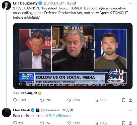 美国总统特朗普的前高级顾问兼首席策略师斯蒂芬・班农 (Steve Bannon)接受采访时称:“特朗普总统今晚应该签署一项行政命令,启动《国防生产法案》,并在今晚午夜之前接管SpaceX。” 马斯克回应称:“班农是智障高峰。” (责任编辑:宋政 HN002)