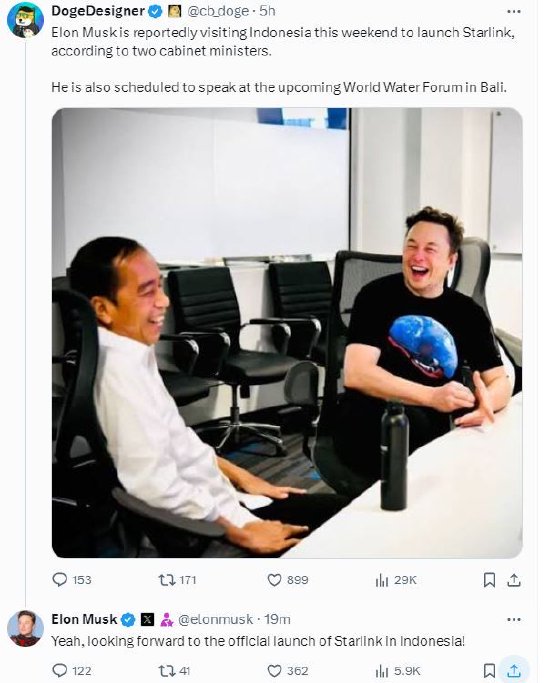 马斯克的一位粉丝在X上分享消息称,据两名印尼内阁部长透露,埃隆・马斯克本周末将访问印尼,启动星链。他还计划在即将在巴厘岛举行的世界水论坛上发表讲话。