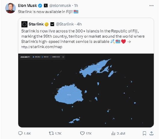 马斯克转发了Starlink官方账号的帖子,后者宣布:“Starlink现已覆盖斐济共和国的300多个岛屿,成为全球第99个可以提供Starlink高速互联网服务的国家、地区或市场。”