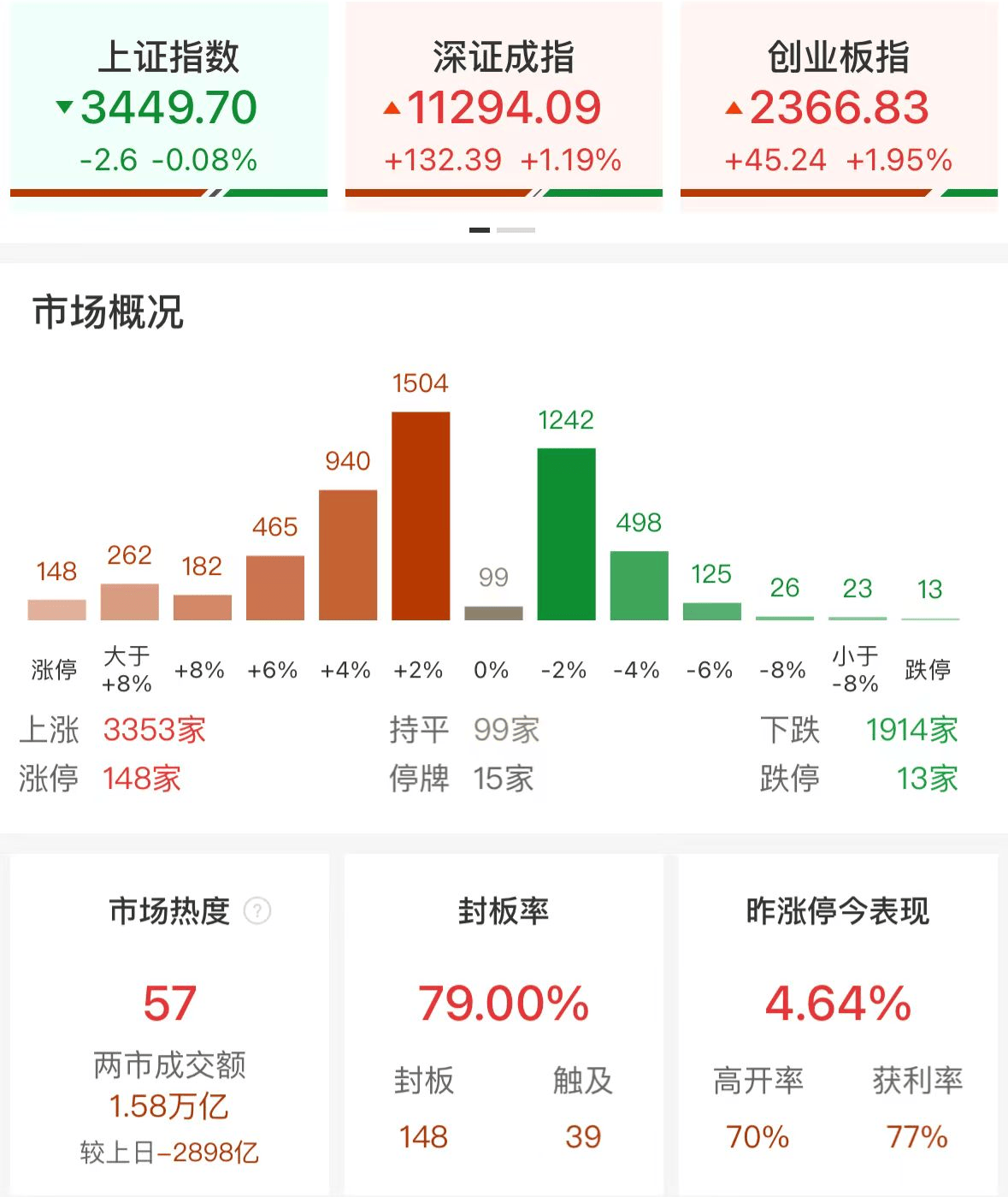 沪指早间震荡调整,深成指、创业板指走势较强,科创50指数涨超4%。 芯片产业链全线爆发,光刻机、封测、设备、设计等多个方向大涨,晶合集成、灿芯股份、国芯科技、芯原股份、大港股份(002077)等多股涨停,北方华创(002371)续创历史新高。光伏、锂电等新能源方向走强,时创能源、天奈科技(688116)、永杉锂业、多氟多(002407)、爱旭股份、安彩高科(600207)等涨停。下跌方面,食品等消费股下挫,黑芝麻(000716)跌停。个股涨多跌少,沪深京三市超3400股飘红,上午半天成交1.6万亿元。午间收盘沪指跌0.08%,深成指涨1.19%,创业板涨1.95%。 (责任编辑:宋政 HN002)