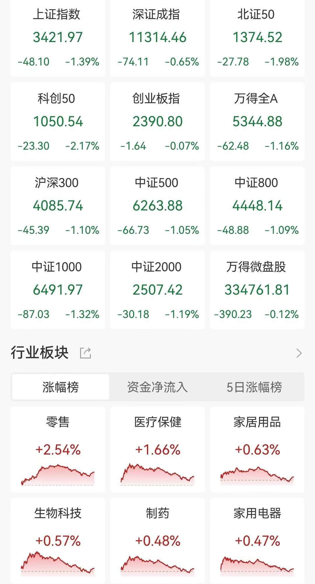格隆汇11月12日|A股主要指数今日早盘震荡走低,午后持续下行;截至收盘,沪指跌1.39%报3421点,深证成指跌0.65%,创业板指跌0.07%。全天成交2.55万亿元,较前一交易日增量430亿元,全市场近3800股下跌。 盘面上,保险板块下挫,天茂集团(000627)跌停;航天航空板块大幅回撤,中航沈飞(600760)跌近8%;华为欧拉板块走低,麒麟信安一度跌近10%;船舶制造板块走弱,中国动力(600482)领跌;教育、光刻胶及AI语料等板块跌幅居前。另外,医保出台“预付金”政策,医药板块逆市走高,医药商业、中药、独家药及医疗服务等方向领涨,中国医药(600056)、长药控股等多股涨停;商业百货板块拉升,供销大集(000564)涨停;3D摄像头、能源金属等板块涨幅居前。(格隆汇) (责任编辑:宋政 HN002)
