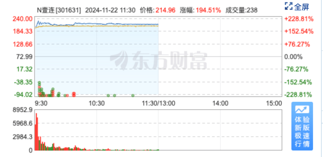 A股市场今天上午整体低位震荡,市场临近午盘小幅跳水,人工智能概念大涨,Wind人工智能指数盘中涨幅一度超过2%,相关个股掀起涨停潮。 今天A股市场有一只新股上市,为壹连科技,上午该股大涨,股价一度高达240元,盘中涨幅达228.81%。若按照上述最高价计算,中一签壹连科技浮盈达8.35万元,为近期新股首日浮盈较高水平。 港股市场今天上午整体波动不大。港股市场股价大幅波动的个股方面,华领医药-B大跌,盘中跌幅一度超过20%。 A股市场上午整体低位震荡 人工智能概念大涨 A股市场今天上午整体低位震荡。 行业板块和赛道方面,互联网、公共交通、传媒娱乐等板块涨幅居前,保险、煤炭、化纤等板块表现相对疲弱。 概念板块方面,人工智能概念又大涨,Wind人工智能指数盘中涨幅一度超过2%,相关个股掀起涨停潮。 消息面上,工业和信息化部运行监测协调局负责人何海林今日在国务院政策例行吹风会上表示,研究出台制造业数字化转型行动方案和推动人工智能赋能新型工业化行动方案,建设一批智能工厂和智慧供应链,大力发展智能物流装备,推动在数据流动、商品溯源、电子签名等领域构建与国际接轨的跨境电子商务规则,拓展数字贸易的新空间。 多只强势股继续封住涨停。 比如南京化纤(600889)盘中再度触及涨停,这是该股连续第6个交易日盘中触及涨停。 南京化纤昨晚发布股票价格异常波动公告称,鉴于近日公司股票剔除大盘和板块整体影响后的实际波动幅度较大,敬请广大投资者注意二级市场交易风险,理性决策,审慎投资。 在经营风险方面,公告还表示,公司目前主营业务仍为纤维素纤维、PET结构芯材,未发生重大变化。2023年度,公司营业收入为4.74亿元,归属于上市公司股东的净利润为-1.85亿元。公司2024年前三季度营业收入为4.58亿元,归属于上市公司股东的净利润为-1.59亿元,业绩持续亏损。 在重大事项不确定风险方面,南京化纤公告称,公司正在筹划重大资产重组事项,该事项仍处于预案阶段。公司本次交易的审计、评估工作尚未完成。本次交易尚需履行必要的内部决策程序,并需经有权监管机构批准后方可正式实施,本次交易实施存在不确定性,敬请广大投资者关注后续公告并注意投资风险。 此外,广博股份(002103)、泰坦股份、浙江建投等股票亦连续涨停。 新股壹连科技一度大涨228.81% 今天A股市场有一只新股上市,为壹连科技,上午盘中该股大涨,股价一度高达240元,涨幅一度达228.81%。若按照上述最高价计算,中一签新股浮盈达8.35万元,为近期新股首日浮盈较高水平(该股发行价为72.99元)。 招股资料显示,壹连科技是一家集电连接组件研发、设计、生产、销售、服务于一体的产品及解决方案提供商。公司深耕电连接组件领域,目前已在广东深圳、福建宁德、江苏溧阳、四川宜宾、浙江乐清、广东肇庆等多地建有生产基地,主要产品涵盖电芯连接组件、动力传输组件以及低压信号传输组件等各类电连接组件,形成了以新能源汽车为发展主轴,储能系统、工业设备、医疗设备、消费电子等多个应用领域齐头并进的产业发展格局。 招股资料称,在多年的发展历程中,公司始终紧跟国家政策与行业发展变化的趋势,依托在电连接领域的技术沉淀和行业经验,产品应用领域从工业设备、消费电子等传统应用领域逐步向新能源汽车、储能等新兴领域拓展。公司拥有优质的客户资源,下游客户包括宁德时代(300750)、小鹏汽车、沃尔沃、大众、日产、吉利汽车、零跑汽车、长安汽车(000625)、威睿电动、欣旺达(300207)、海博思创、阿特斯、晶科能源、天合光能、尼得科、多美达、迈瑞医疗(300760)等国内外各领域知名企业。 港股市场上午整体波动不大 港股市场今天上午整体波动不大,恒生指数围绕60日线波动。 恒生指数成份股中,舜宇光学科技、比亚迪(002594)电子、农夫山泉等涨幅居前。百度集团-SW领跌,盘中跌幅一度超过10%。 百度集团昨晚发布的2024年第三季度业绩公告显示,2024年第三季度,百度集团总收入为人民币336亿元(47.8亿美元),同比减少3%,百度核心收入为人民币265亿元(37.8亿美元),较去年基本持平;在线营销收入为人民币188亿元(26.8亿美元),同比减少4%,非在线营销收入为人民币77亿元(11亿美元),同比增长12%,主要由智能云业务带动。另外,爱奇艺收入为人民币72亿元(10.3亿美元),同比减少10%。 其他股价大幅波动的个股方面,华领医药-B大跌,盘中跌幅一度超过20%。 华领医药发布公告称,公司董事会宣布,于2024年11月21日,其全资附属公司华领医药技术(上海)有限公司(“华领上海”)向拜耳医药保健有限公司(“拜耳”)发出书面通知,表示有意自2025年1月1日起,将本公司开发用于治疗2型糖尿病的首创葡萄糖激酶激活剂华堂宁®(dorzagliatin片剂)在中国的商业化责任过渡至本公司。 公告称,于2020年8月17日,有关各方就华堂宁®在中国的商业化建立合作关系并订立相关的独家推广服务协议(“协议”)。根据协议,拜耳获得华堂宁®于中国的独家商业化权。自拜耳合作以来,已达成数个与华堂宁®相关的里程碑。该等里程碑包括:华堂宁®于2022年10月获中国国家医药品监督管理局批准在中国销售;其自2024年1月1日起纳入国家医保药品目录(NRDL);截至本公告日期,其已进入中国2000多家医院;及其最近被中华医学会糖尿病学分会纳入《中国糖尿病防治指南(2024版)》。 公告表示,为实现过渡