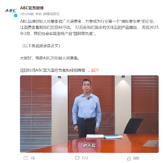 11月22日下午消息,ABC品牌创始人邓景衡通过品牌官方微博发布视频致歉,回应近期ABC因国标负差和经销商客服的不当言论产生的相关争议。 邓景衡表示:“在这里我不做任何辩解,再次郑重地向大家道歉。公司力争成为行业第一个国标零负差的企业,12月份公司就会有优化后的产品推出,而在2025年3月也会实现全线产品国标零负差。” 邓景衡表示,我们在这里郑重承诺,12月份就会有部分产品实现国标零负差,2025年3月全线产品实现国标零负差,有差的也是正差。也恳请大家给我们一些时间来做调整。“网友说得对,我们应该以更高的标准要求自己,以更高的标准来服务广大的女性,我们可以做得更好。” “大家的声音,我们都听到了。感谢大家对我们的批评和督促。”邓景衡表示。 近日,网友爆料“卫生巾实际长度与标示长度不一”“偷工减料”一事引起广泛关注。不少网友实测发现,绝大多数卫生巾品牌都存在“偷工减料”现象,众多知名卫生巾品牌陷入舆论风波。其中,ABC疑因回应“如果觉得接受不了可以不买”,被人们质疑态度恶劣,相关话题冲上热搜。 (责任编辑:宋政 HN002)
