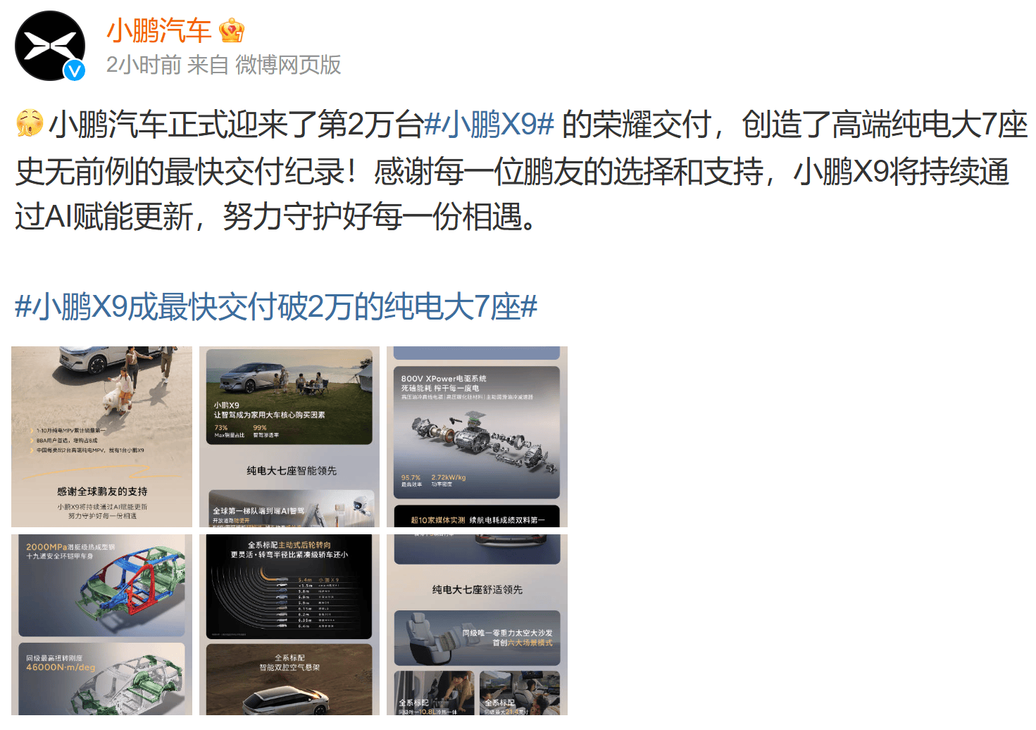凤凰网科技讯(作者/王馨梓) 11月25日,小鹏汽车今日宣布,小鹏 X9 交付量正式突破 2 万台,创下高端纯电大七座车型的最快交付纪录。 官方数据显示,小鹏X9在1-10月的纯电MPV累计销量中排名第一,BBA用户增购占8 成。小鹏X9车身尺寸为5293/1988/1785mm,轴距达到3160mm,整体空间表现优越,售价区间为35.98万至41.98万元。 小鹏X9拥有全域800V、前后一体式铝压铸、XNGP等扶摇架构核心技术,标配后轮转向。动力方面,该车将提供单电机和双电机版本供消费者选择,前者最大功率为235千瓦;后者前电机最大功率为235千瓦,后电机为135千瓦。零百加速5.7秒,最高时速达 200km/h。 目前该车提供610长续航(Pro、Max)、720超长续航(Pro、Max)、640四驱高性能三个续航版本,续航里程分别为610km、702km和640km。 (责任编辑:董萍萍 )