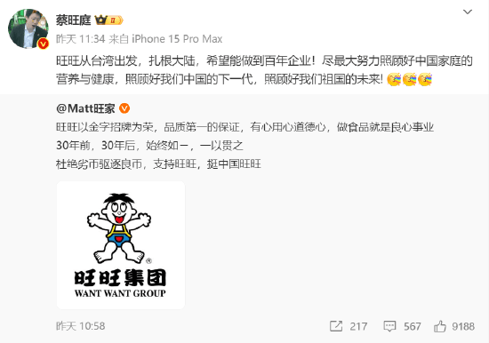 11月25日上午消息,“旺旺集团三公子”蔡旺庭发布微博表示,“旺旺从台湾出发,扎根大陆,希望能做到百年企业!尽最大努力照顾好中国家庭的营养与健康,照顾好我们中国的下一代,照顾好我们祖国的未来! ” 之前,旺旺集团首席营运官发文称,做食品就是良心事业,杜绝劣币驱逐良币。“旺旺以金字招牌为荣,品质第一的保证,有心用心道德心,做食品就是良心事业。30年前,30年后,始终如一,一以贯之。杜绝劣币驱逐良币,支持旺旺,挺中国旺旺。” 此前,有网友反映称在旺仔牛奶中喝出异物,疑似为老鼠。旺旺集团发布声明称:生产线没有异常,产品质量安全可靠。 (责任编辑:宋政 HN002)