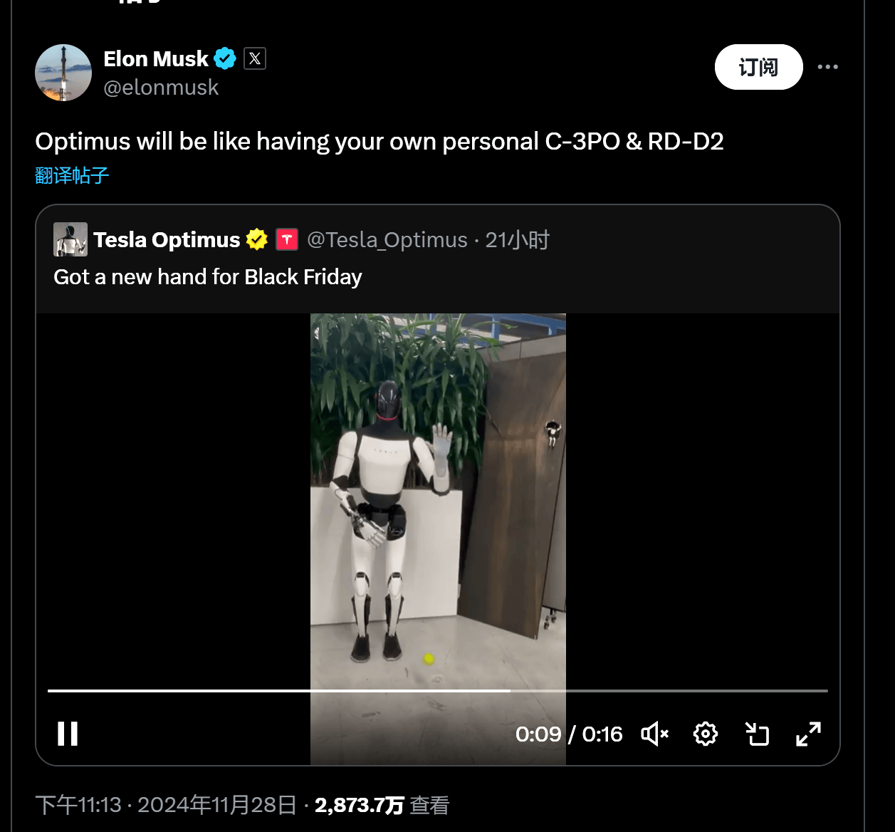 当地时间11月28日,特斯拉机器人官方账号发布新动态:准备了新的手来迎接黑色星期五,同时放出的视频展示了Optimus机器人的最新进展。从视频中可以看到,Optimus单手稳稳地接住了迎面抛来的网球,手指可相对灵活地弯曲。 图片来源:X 这一视频迅速引来网友围观,截至发稿,观看次数已经高达3446万次。 特斯拉工程师米兰・科瓦克表示,这款机械手的进步具有里程碑意义,自由度比上一代增加了一倍,手部有22个自由度,手腕和前臂有3个自由度(注:人手拥有27个自由度,自由度越高,越能完成更复杂和精细的动作)。科瓦克表示,视频演示是在实验室中通过实时远程操作进行的,特斯拉计划很快制造出配备这款先进机械手的机器人。 特斯拉CEO马斯克两周前也表示,他相信最终每个人家里都会至少拥有一台特斯拉的人形机器人。 手部有22个自由度!特斯拉Optimus机器人灵活度接近人类 当地时间11月28日,特斯拉机器人在X上发布新动态,展示了Optimus机器人的新进展。从视频演示看,Optimus单手稳稳接住了迎面抛来的网球。这只新手是第二代Optimus机器人的一大亮点。 马斯克转发视频并评论道:“Optimus将成为你专属的C-3PO和RD-D2(C-3PO和RD-D2都是星球大战里的机器人角色)。” 图片来源:X 帖子下方,有网友称,对大多数人来说,要(这样)接住东西也比较困难。由此可见,机器人能做到这一点是非常令人印象深刻的,因为这涉及到快速球检测、轨迹预测、运动跟踪和抓握时机等复杂技术。 图片来源:X 初创机器人公司1X的工程师Eric Jang也发文感叹,“不得不佩服他们……连续两次接球是动态遥控质量的绝佳证明。不仅机械+肌腱的小型化令人印象深刻,还实现了低延迟遥控+相机校准+重新定位。” 图片来源:X 特斯拉工程师米兰・科瓦克表示,这款机械手的进步具有里程碑意义,自由度比上一代增加了一倍,手部有22个自由度,手腕和前臂有3个自由度。这种接近人类的灵活度也预示着Optimus可应用于更广泛且复杂的多用途场景,包括自动化仓库到老年人护理。 马斯克最近表示,Optimus有一天会成为一个家用机器人,可以做“你想做的一切:照顾你的孩子、遛狗、修剪草坪、买杂货、当你的朋友、端上饮料。” 虽然大多数网友在评论区对Optimus的新技能赞不绝口,但仍有人质疑Optimus的行动是完全自主还是在很大程度上是远程操作的。 有人评价称,“看起来像是一个人接住了球,”这一评论让人想起2021年Optimus面向公众推出时的情景,当时它并不是一个可以正常运转的机器人,而是一个穿着紧身衣的人在扮演机器人。 对此,科瓦克表示,视频演示是在实验室中通过实时远程操作进行的。这意味着距离大众期待的自主机器人还有一段距离。 科瓦克同时表示,团队到年底前仍有一些工作需要完成,特别是在扩展触觉传感集成(新一代手比上一代的表面覆盖范围大得多),以及通过肌腱实现更精细的控制方面。由于所有驱动装置被移至前臂,这增加了其重量,团队还在想办法减轻前臂重量。一个有趣的挑战是如何让手指和手掌拥有足够柔软度/柔顺性的保护层,同时又不影响触觉传感。 不过,科瓦克透露,特斯拉计划很快制造出配备这款先进机械手的机器人。 社交名人卡戴珊体验Optimus:能跑能舞,还能陪你比爱心 11月中旬,美国社交名人金・卡戴珊在其社交媒体账号上介绍了她的“新朋友”:Optimus。至于这款机器人是卡戴珊自己购买的,还是特斯拉基于宣传目的赠送的,目前尚未可知,同时,也不清楚这款机器人是否是具备更高灵活度的Optimus。 在介绍视频里,卡戴珊详细介绍并演示了Optimus的一些能力,包括和她一起完成爱心手势。视频中,卡戴珊问机器人下一步想做什么时,机器人甚至模仿了慢跑动作。 图片来源:Instagram 除此之外,Optimus还在视频中完成了一系列复杂任务,比如说模仿卡戴珊的动作、跳草裙舞,以及输掉石头剪刀布游戏。 马斯克认为,Optimus可以通过大幅降低劳动力成本和提高生产力来彻底改变行业并提供经济实惠的家用解决方案。人形机器人的广泛应用将产生巨大的经济影响。 马斯克表示,他预计这款人形机器人将于明年开始在特斯拉工厂工作,负责“危险、重复和无聊的任务”。到2026年,这款机器人可能会向其他公司推出。 目前,马斯克预计Optimus的定价将为3万美元左右,不过之后会降价到2万美元,并且将支持任何语言。 受Optimus机器人利好消息影响,截至发稿,特斯拉上涨1.2%。美股其他机器人概念公司如Symbotic也有所上涨。 免责声明:本文内容与数据仅供参考,不构成投资建议,使用前请核实。据此操作,风险自担。 每日经济新闻 (责任编辑:郭健东 )