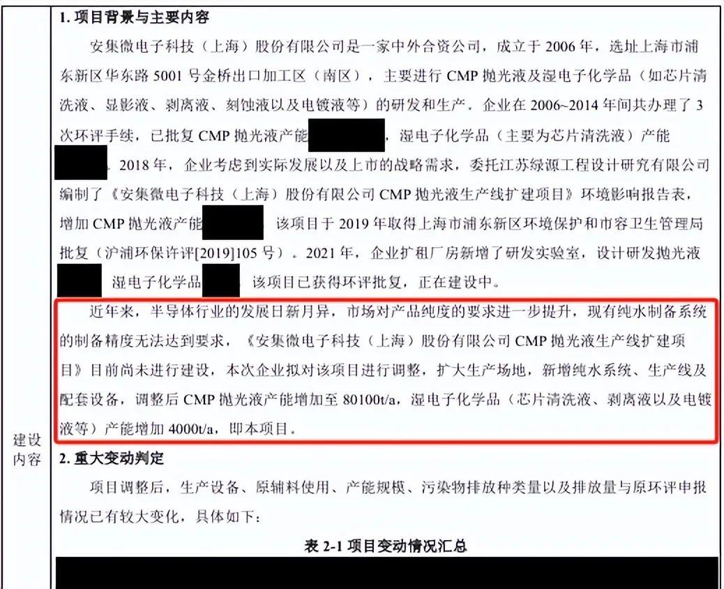 本文授权来自《中国民商》 作者:方 升 编辑:张佳茗 据上交所官网,安集科技(688019)的再融资于11月22日获得证监会的批文(证监许可〔2024〕1555 号),目前还尚未更新注册结果。 安集科技是首批登陆科创板的企业之一,公司深耕高端半导体材料领域,成功打破了国外厂商对集成电路领域化学机械抛光液和部分功能性湿电子化学品的垄断。 产能利用率未饱和 安集科技近年来的业绩整体表现不错,总体上呈现增长态势。 据募集说明书,2020年至2023年1-3月(下称:报告期),安集科技(688019)分别实现营业收入42,237.99万元、68,666.06万元、107,678.73万元和26,933.97万元,同期归属于母公司股东的净利润分别为15,398.91万元、12,508.41万元、30,143.70万元、7,618.20万元。 据安集科技2023年年报,当年实现营业收入1,237,871,129.22元,归属于上市公司股东的净利润402,733,766.50元,分别同比增长了14.96%、33.60%。另在10月29日晚间,安集科技发布2024年三季报,公司前三季度实现营业收入131,223.13万元,归属于上市公司股东的净利润为39,256.82万元,较上年同期分别增长46.10%、24.46%。 报告期各期末,安集科技资产负债率分别为18.58%、28.17%、25.69%和22.20%,低于募集说明书中选取的境内外可比公司均值,流动比率和速动比率数值要高于均值,偿债能力相对较强。 公告显示,本次向不特定对象发行可转换公司债券拟募集资金总额不超过88,000万元(含本数),扣除发行费用后募集资金净额将用于投入建设上海安集集成电路材料基地项目、上海安集集成电路材料基地自动化信息化建设项目、宁波安集新增2万吨/年集成电路材料生产项目、安集科技上海金桥生产基地研发设备购置项目和补充流动资金。 除了直接补充流动资金24,000.00万元外,上海安集集成电路材料基地项目拟使用募集资金38,000.00万元(其中预备费1,625.00万元、铺底流动资金175.00万元),宁波安集新增2万吨/年集成电路材料生产项目拟使用募集资金6,000.00万元(其中预备费270.00万元、铺底流动资金330.00万元)。上述预备费、铺底流动资金以及补充流动资金合计占本次募集资金总额的30.00%。 安集科技报告期内的收入均来自于集成电路行业,其中化学机械抛光液收入占比均超过85%。安集科技产品分为化学机械抛光液和功能性湿电子化学品,报告期各期,化学机械抛光液的产能分别为23,234.02吨、24,547.88吨、24,547.88吨、7,273.06吨,产量分别为9,941.47吨、16,649.76吨、22,486.08吨、4,783.52吨,产能利用率分别为42.79%、67.83%、91.60%、65.77%。 功能性湿电子化学品产能分别为1,233.35吨、3,430.57吨、4,423.35吨、852.97吨,产量分别为694.96吨、1,812.84吨、2,332.04吨、424.54吨,产能利用率仅为56.35%、52.84%、52.72%、49.77%。 另外,据问询回复,首发募投项目中“安集集成电路材料基地项目”于2021年12月结项,截至2022年12月31日止,该项目累计实现功能性湿电子化学品产量870.38吨,累计产能利用率为60.18%。 此前,安集科技还以简易程序向特定对象发行股票募集资金20,713.62万元,用于建设宁波安集化学机械抛光液建设项目、安集科技上海金桥生产线自动化项目、安集科技上海金桥生产基地分析检测能力提升项目。截至2023年11月30日,以上三个项目资金投入比例分别为27.80%、16.84%、23.26%。 安集科技首发募集资金建设项目安集微电子科技(上海)股份有限公司CMP抛光液生产线扩建项目(下称:抛光液扩产项目)经历2次延期,预计于今年7月达到预计可使用状态,产能待释放。 IPO募投项目或重大变动 值得注意的是,安集科技首发时的募投项目建设或有重大变动。 据问询回复,抛光液扩产项目计划投资12,000.00万元,截至2023年11月30日,募集资金实际投资额12,653.48万元,募资金投入进度为105.45%。 安集科技科创板上市时的招股书介绍,抛光液扩产项目建设期预计为2年,安集科技原计划通过租用上海金桥出口加工区开发股份有限公司位于金桥出口加工区(南区)T6-8、T6-9、T6-10、T6-11幢底层厂房进行改造。 科创板上市后,2021年4月28日,安集科技召开了第二届董事会第九次会议和第二届监事会第七次会议,审议通过了《关于变更部分募投项目实施地点的议案》,将抛光液扩产项目实施地点变更为上海金桥出口加工区开发股份有限公司位于金桥出口加工区(南区)T6号地块,且项目建设期延长至2023年7月。 后又因全球公共卫生事件反复等不可抗力因素,导致项目的产线设备交货周期延长,安装调试进度等受到了一定影响,最终也导致了项目建设进度较原计划有所延长,抛光液扩产项目达到预定可使用状态日期进一步延期至2024年7月。 根据绿网,安集科技有一版2022年抛光液生产线扩建项目(调整)环评文件。该环评文件指出,半导体行业的发展日新月异,市场对产品纯度的要求进一步提升,现有纯水制备系统的制备精度无法达到要求,《安集微电子科技(上海)股份有限公司CMP抛光液生产线扩建项目》目前尚未进行建设,本次企业拟对该项目进行调整,扩大生产场地,新增纯水系统、生产线及配套设备,调整后CMP抛光液产能增加至80,100t/a,湿电子化学品(芯片清洗液、剥离液以及电镀液等)产能增加4,000t/a,即本项目。 (截图来自抛光液扩产项目(调整)环境影响报告表) 该环评文件中还介绍,抛光液扩产项目生产工艺发生了重大变动。项目产品品种新增湿电子化学品,CMP抛光液新增粉体原料生产工艺,新增QC检验工序,新增排放污染物种类:氟化物,调整后