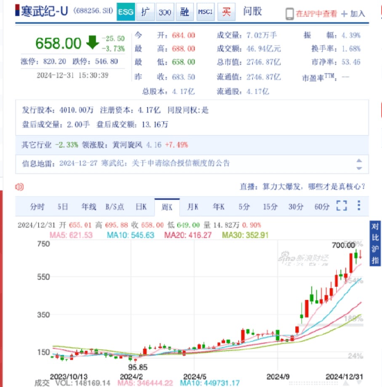 文 | 仟茂科技刘丽丽 2024年A股涨幅排名终于尘埃落定,笑到最后的是寒武纪――截止12月31日收盘,寒武纪以387%涨幅夺得“股王称号”,总市值近2800亿。创始人陈天石身价飙升,成为江西首富。 但寒武纪的业绩却乏善可陈。从2017年到2024年上半年,寒武纪已累计亏损约55亿元。最近一次的财报显示,其2024年前三季度净亏损为7.24亿元,扣非后净亏损为8.62亿元。其中第三季度净亏损为1.94亿元,扣非后净亏损为2.54亿元。 值得注意的是,寒武纪的研发费用从2023年以来一降再降,定增的资金投入对于研发来说也是杯水车薪。分析人士认为,“如果不能持续保持至少十年的基础研究投入,寒武纪恐将难逃‘造富机器’的宿命”。 漂亮的股价,丑陋的业绩 寒武纪股价今年走出了漂亮的弧线。自2024年9月下旬,寒武纪的股价就开始飞涨,从9月25日的220.01元算起,12月23日一度达到700元高点,成为A股仅次于贵州茅台(600519)的存在,位列全A股第二高价股。 随着寒武纪股价上涨,公司实控人陈天石的身价也水涨船高,目前,其持有公司股票的市值已超过800亿元。此前报道,胡润研究院发布2024胡润百富榜。来自江西南昌的陈天石财富较去年增长73%,排名上升150位,成为南昌首富。 但是,从2017年到2024年上半年,寒武纪已累计亏损约55亿元。借助AI的风口,赔钱的寒武纪为什么股价连创新高? “寒武纪对标的是英伟达,英伟达是一个A股股民看不见、摸不着的幻影,那天空就是它的上限了。”有分析人士认为,市场对寒武纪的追捧,可能也折射出我们对于芯片的期待,叠加了情绪加持。 英伟达作为市场领头羊,其市值已接近3.5万亿美元,占据了全球AI芯片市场90%的份额。有人认为,如果寒武纪真的成为中国的“英伟达”,那“寒武纪现在不是太贵,而是太便宜了。” 截至2024年第三季度末,寒武纪的净资产是53亿元,市净率达到了34倍;如果按市销率计算的话,寒武纪已超过200倍,远远高于英伟达。 寒武纪能否成为第二个英伟达?创始人陈天石2018年曾许下豪言壮语,公司将在三年内占领中国高性能人工智能芯片市场的30%,并在全球10亿台设备上植入其芯片。六年过去了,这个出生于1985年的年轻人,成了南昌首富,当年许下的豪言壮语实现了多少? 作为一家芯片公司,基础研究和研发投入是体现实力和潜力的重要指标。令人担忧的是,伴随资金压力,寒武纪的研发费用已经一降再降。 2023年,寒武纪研发费用11.18亿,同比降超26%,成立以来首次年度下降。2024年上半年公司研发费用又同比减少7.27%。从三季报数据看,其研发投入同比下降了9.91%,而前三季度研发投入也同比下降8.13%,三季度以及前三季度研发投入占营收比例也大幅减少。 2020年,寒武纪上市,募资仅25.82亿元,不到同期上市的中芯国际二十分之一。2022年,寒武纪提出26.5亿元的定增预案,在监管质疑下一砍再砍,最终仅募16.7亿。2024年中期,寒武纪账面现金只剩13.83亿,较2023年底缩水超65%。 上次定增的资金,主要用于寒武纪先进工艺平台芯片项目、稳定工艺平台芯片项目、面向新兴应用场景的通用智能处理器技术研发项目,及补充流动资金。 有分析人士表示,寒武纪定增的主要目的是提升其芯片的集成度、计算能力和带宽,以提高竞争力,但这样的研发投入在芯片领域,也不过是杯水车薪。 资本追捧是把双刃剑 对于寒武纪对标英伟达的未来,有人提出了两个疑问:产品能不能赶上英伟达?资金能不能撑到成为“中国英伟达”那天? 此前,英伟达高端产品A100被限制出口。寒武纪在2021年推出了“思元”,推理算力相当于A100的40%,训练性能约为A100的20%。该产品已在阿里云、浪潮、曙光等服务器商以及科大讯飞(002230)等AI算法公司实现批量供货。 2023年寒武纪推出了新一代思元590芯片,性能上直接与A100对标。根据百度内部测试结果,思元590支持绝大多数主流模型。在不同模型上性能表现各异,有的模型训练性能非常接近A100,而其他的则仅达到A100的50%左右,整体性能大致可达到A100的80%水平。 寒武纪的MLU370和MLU220芯片已经广泛应用于多个行业,并被国内多家头部企业采用,出货量累计超过一百万片。MLU370是面向云端的集成推理与训练的智能芯片,而MLU220则被用于边缘计算设备和智能终端。 有分析人士表示,这些产品在性能上与国际领先产品尚存差距,如何缩小这个差距,甚至实现赶超,并非易事。“由于在高端技术和产品多样性上与领先水平的差距,且与民间市场需求的契合度不高,其业务拓展面临挑战难以实现大规模的市场拓展。” 财报显示,寒武纪2024年前三季度计入的政府补助为1.05亿元,其中,第三季度计入的政府补助为5254万元。 值得注意的是,寒武纪三季报中,预付款、存货都同比大幅增长,同时现金流量表购买商品的现金流支出直接几何倍数增长。市场对于这些变化的看法莫衷一是。业内人士认为,这可能引发市场对其芯片制造突破的猜测,从而导致资金对其市值预期向上修正。 狂热的资本追捧,对一家处于关键成长期的公司来说,无疑是把双刃剑。毕竟英伟达有较高的营收和净利润,但寒武纪现阶段完全靠“想象力”。 上述人士认为,“如果寒武纪能在基础研究上实现突破,能在基础研究上每年投入至少50亿人民币,并且做到连续10年的高投入,其产品的原创性,技术性,才有可能实现陈天石所言的在全球10亿台设备上运用。” “如果不能持续保持至少十年的基础研究投入,