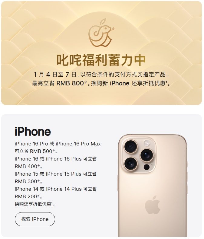 【大河财立方消息】1月2日,苹果官网发布公告称,1月4日至1月7日,用户以符合条件的支付方式买指定产品,最高立省800元。 苹果官网显示,用户购买iPhone 16 Pro或iPhone 16 Pro Max可立省500元,用户购买iPhone 16或iPhone 16 Plus可立省400元,购买iPhone 15或iPhone 15 Plus可立省300元,购买iPhone 14或 iPhone 14 Plus可立省200元。 此外,苹果官网显示,用户购买15英寸MacBook Air(M3)可立省800元,购买13英寸MacBook Air (M3)可立省700元。13英寸MacBook Air (M2) 可立省600元。苹果旗下Apple Watch、AirPods等产品也有不同程度的优惠。 苹果表示,iPhone、iPad、Mac 笔记本电脑、Apple Watch、AirPods、Apple Pencil 分别为六个不同类别,每名用户每个产品类别限购2件,超过此数量限制的产品不再享受立减优惠。 责编:李文玉 | 审核:李震 | 监审:万军伟 (责任编辑:张晓波 )