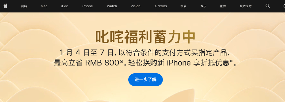 每经AI快讯,苹果官网发布消息称,1月4日至7日,用户以符合条件的支付方式买指定产品,最高立省800元。