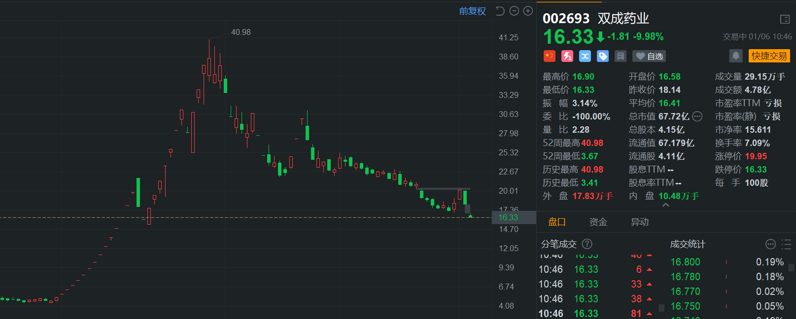 格隆汇1月6日|双成药业(002693)(002693.SZ)连续2日跌停,报16.33元刷新调整新低,自高点累计回撤近60%,总市值跌破70亿元。消息上,公司1月2日晚间发布股票交易异常波动及风险提示性公告,公司正在筹划重大资产重组事项。本次重组事项尚需履行必要的内部决策程序,并需经有权监管机构批准后方可正式实施,能否最终成功实施存在不确定性。值得注意的是,截至2024年前三季度,公司营业收入为1.27亿元,净利润为负。根据相关规定,如果2024年度公司无法实现利润总额、净利润或扣除非经常性损益后的净利润均为正,且营业收入低于3亿元,将面临退市风险警示。(格隆汇) (责任编辑:宋政 HN002)