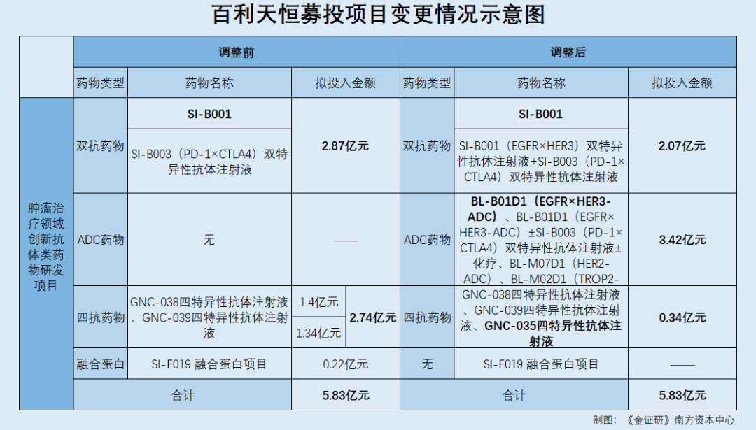 《金证研》南方资本中心 相宁/作者 西洲 映蔚/风控 近年来,抗体药物偶联药物(以下简称“ADC”)成为近几年制药行业最火的领域之一。2023年12月,四川百利天恒药业股份有限公司(以下简称“百利天恒”)与Bristol-Myers Squibb Company(以下简称“BMY”)就一款ADC药物BL-B01D1达成合作,潜在总交易额最高可达84亿美元,打破了国内创新药出海授权的新纪录。截至2025年1月3日,BL-B01D1已有5项适应症被药审中心纳入突破性治疗品种名单。 关于双方的合作,百利天恒独家负责BL-B01D1国内的开发、商业化以及生产,BMY获得BL-B01D1在全球其他市场的独家许可。而在与BMY达成合作之前,百利的原核心技术人员或跳槽至BMY。合作当期即2024年一季度,百利天恒收到BMY支付的首付款,扭亏为盈,同年5月商讨港股上市事宜。 值得注意的是,在签订合作协议后,百利天恒负责新药研发的在美全资子公司的首席执行官及首席医疗官,来自BMY。此外,百利天恒与BMY成立了联合指导委员会,如双方之间存在争议,关于联合指导委员会职权范围内的所有其他问题,BMY将拥有最终决策权。 一、科创板上市三个月内调整拟使用募集资金并新增子项目,创新药SI-B001研发进度或被竞品“反超” 在“瞬息万变”的资本市场中,取得商业先机十分重要。 2023年1月,百利天恒以创新药SI-B001为主推药物登陆科创板,并称SI-B001临床进展最快。此番申报港交所,百利天恒在研产品管线将另一种创新药单独列示,称以双抗ADC药物BL-B01D1为代表,有潜力成为泛肿瘤治疗的基石药物。截至2024年12月,SI-B001尚处于III期临床试验,研发进度或落后于曾处于同一临床阶段的竞品。 1.1 申报科创板时双特异性抗体SI-B001临床进展最快,申报港交所称以双抗ADC药物BL-B01D1为代表 据东方财富(300059)Choice数据,2023年1月6日,百利天恒登陆科创板。 据百利天恒签署日为2022年11月1日的招股说明书(以下简称“签署于2022年11月1日的科创板招股书”),申报科创板期间,百利天恒的主营业务为药品研发、生产与营销,拥有化药制剂与中成药制剂业务板块和创新生物药业务板块。 申报科创板期间,SI-B001系百利天恒重点推进的在研产品之一。 据签署于2022年11月1日的科创板招股书,截至2022年8月28日,百利天恒披露的创新生物药研发管线的整体进展情况显示,其创新生物药研发管线分为“SI-B001”及“其他进入临床研究的创新生物药品种”,并单独披露SI-B001相关信息。 截至签署日2022年11月1日,百利天恒临床进展最快的SI-B001处于II期临床试验阶段,其他创新生物药双抗药物SI-B003、GNC系列多抗、及ADC药物等处于I期临床试验阶段,上述阶段属于创新药研发环节的早期或早中期。 可见,申报科创板期间,百利天恒临床进展最快的创新药系SI-B001。 到了申报港交所上市期间,百利天恒在研产品管线将另一种创新药单独列示。 据百利天恒最后实际可行日期为2024年7月3日的招股说明书(以下简称“2024年7月3日港股招股书”),截至2024年7月3日,百利天恒将其在研产品管线分为“BL-B01D1”及“其他管线资产”两类。 截至最后实际可行日期,百利天恒的创新药物管线中共有11个临床阶段药物及两个IND阶段药物,以BL-B01D1(一种目前处于III期临床试验的EGFR×HER3双抗ADC)为代表,百利天恒认为其有潜力成为泛肿瘤治疗的基石药物。百利天恒管线还包括其他两种处于III期临床试验的药物:BL-M07D1及SI-B001。 值得一提的是,基于SI-B001研制出的双抗ADC药物BL-B01D1的成药性也已基本得到验证,基本不存在成药性方面的风险。 显然,2022年申报科创板期间,彼时百利天恒的临床进展最快的创新药系双特异性抗体SI-B001。而此番冲击港交所,百利天恒在研产品管线将另一种创新药单独列示,称以双抗ADC药物BL-B01D1为代表,有潜力成为泛肿瘤治疗的基石药物。 此外,百利天恒科创板上市不久后进行了募投项目的变更。 1.2 科创板上市三个月内调整拟使用募集资金和募投项目,募集资金集中在SI-B001的III期临床和新增的ADC药物项目 据签署于2022年11月1日的科创板招股书,申报科创板期间,百利天恒拟募资14.22亿元,其中拟投入11.09亿元用于“抗体药物临床研究项目”。 需要注意的是,“抗体药物临床研究项目”的研发方向,包括“SI-B001双特异性抗体注射液”、“SI-B003双特异性抗体注射液”、“GNC-038四特异性抗体注射液”、“GNC-039四特异性抗体注射液”、“SI-F019重组人双价ACE2-Fc(n2)融合蛋白注射液”。 此外,该项目的研发项目则包含了“SI-B001+SI-B003”、“GNC-038”、“GNC-039”、“SI-F019”四个子研发项目,“SI-B001+SI-B003”项目的投资金额为5.36亿元。 然而,百利天恒于2023年1月6日在科创板上市,上市3个月内,分别于1月披露因募集资金净额低于预计募集金额而调整募投项目拟投入资金,于3月披露变更部分募投项目子项目。 具体来看,据百利天恒出具日为2023年1月13日的《百利天恒关于调整募集资金投资项目拟投入募集资金金额的公告》(以下简称“募资额调整公告”),扣除发行费用后,百利天恒此番上市共募得8.84亿元,因募得资金低于拟募集金额,其中将“抗体药物临床研究项目”的拟投入金额调整为5.83亿元。 两个月后,百利天恒对“抗体药物临床研究项目”中的部分临床试验子项目进行变更。 据百利天恒出具日为2023年3月23日的《百利天恒关于公司部分募投项目子项目变更的公告》,在“抗体药物临床研究项目”的募集