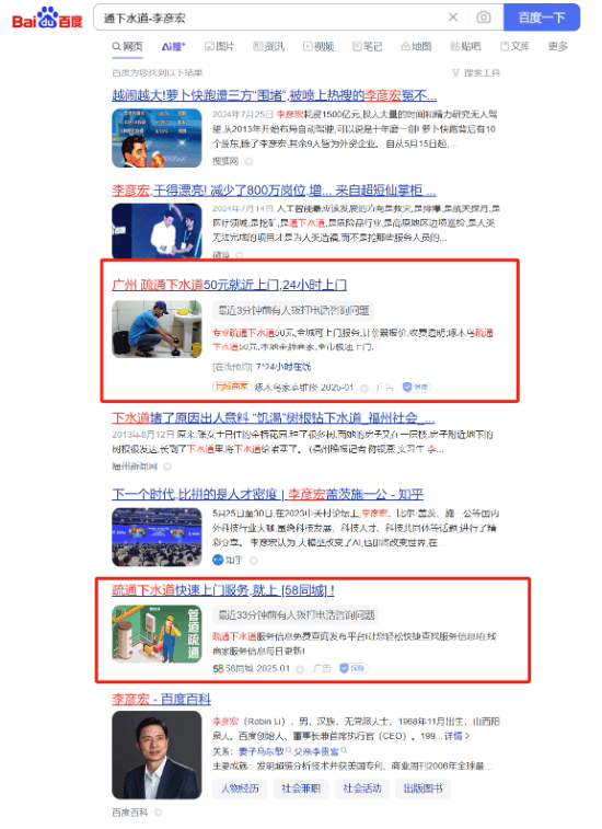 仟茂科技讯 1月7日下午消息,近日自媒体大V阑夕发文称,百度内部系统或设置了李彦宏名字不能与奇怪广告一起显示在搜索结果里的条件。 其发文配图显示,如果以“通下水道”、“通下水道-robin”和“通下水道-李彦宏”三个关键词在百度进行搜索,只有在第一种情况下搜索结果显示有相关广告。不过,其后该大V再度发文表示,“又测试了一下,好像是-这个字符的问题,后面跟什么文本不重要。” 仟茂科技参考前述方法实测发现,如果在百度搜索“通下水道”,首页前5条搜索结果均为广告;百度搜索“通下水道-robin”或“通下水道robin”,首页搜索结果无广告;百度搜索“通下水道-李彦宏”或“通下水道李彦宏”,首页搜索结果有广告,不过数量较第一种情况减少,前5条搜索结果仅1条为广告。 (搜索关键词“通下水道”,首页前5条搜索结果均为广告) (搜索关键词“通下水道-robin”,搜索结果无广告) (搜索关键词“通下水道-李彦宏”,搜索结果有广告但数量减少) 仟茂科技再以“通下水道-马云”以及“通下水道马云”两个关键词进行搜索,搜索结果与“通下水道-李彦宏”或“通下水道李彦宏”情况类似,首页搜索结果中无广告或广告数量大幅减少。 对于前述自媒体大V的猜测言论,截至发稿,百度暂无回应。 来源:仟茂网 (责任编辑:宋政 HN002)