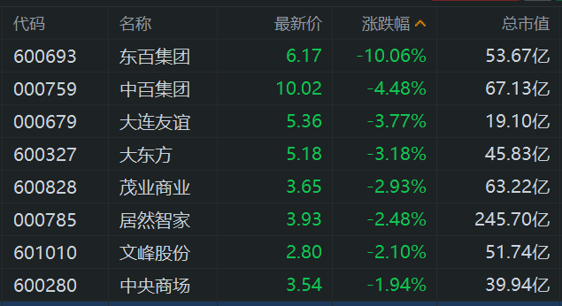 格隆汇1月8日|零售股延续弱势下跌行情,其中,东百集团(600693)再度跌停,为连续3日跌停,中百集团(000759)跌4.48%,大连友谊(000679)、大东方(600327)跌超3%,茂业商业(600828)、居然智家、中央商场(600280)、南宁百货(600712)跟跌。 (责任编辑:宋政 HN002)