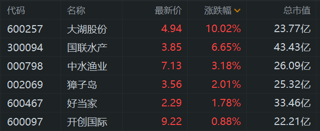 格隆汇1月8日|水产养殖股集体拉升上涨,其中,大湖股份(600257)直线拉升封涨停,国联水产(300094)涨超7%,中水渔业(000798)涨超3%,獐子岛(002069)、好当家(600467)、开创国际(600097)等跟涨。 (责任编辑:宋政 HN002)