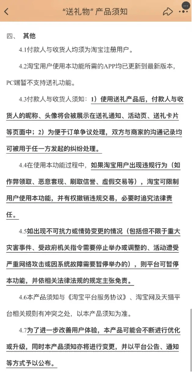 文|仟茂科技闫妍 临近春节,各大平台“送礼大战”悄然打响。 仟茂科技发现,淘宝客户端小范围上线了“送礼物”功能。淘宝客服表示,目前该功能的部分订单支持微信支付,但礼物领取为24小时内有效,超时礼物自动失效。 续微信小店开启“送礼物”功能后,市场热情被点燃。短短一个月内,抖音快速跟进类似玩法,如今随着淘宝的加入,三大超级App均推出了“送礼物”功能,它们能延续“红包大战2.0”的盛况吗? 淘宝“送礼物”,领取时限24小时 与微信的“蓝包”类似,淘宝也同样支持赠送的商品,只不过需要通过淘口令、二维码等方式分享给朋友。 据悉,用户在淘宝平台可以选择“支持送礼”的商品,点击“去送礼”完成下单支付(不用填写收货地址),点击送给朋友,通过淘口令、二维码等方式分享给朋友,即可完成送礼物。 对于收礼物的人来说,可以复制分享链接到淘宝App,点开礼物 -填写收货地址和安全口令- 收下礼物,等待物流运输,即可完成收礼物。 对此,淘宝官方人工客服告诉仟茂科技,“送礼物”功能近期是刚推出的活动,活动是持续性的,目前还未接收到具体结束时间。 淘宝官方人工客服还表示,“淘宝平台目前部分订单是支持微信支付的,一些商家和商品特殊性暂无法使用微信支付,可以尝试更新淘宝APP到最新版,最终订单是否可以使用请以淘宝付款页面为准。” 值得注意的是,礼物领取24小时内有效,超时礼物自动失效不能再领取。目前该功能不支持多个商品合并送礼。 至于领礼物页面异常怎么办?淘宝客服给出了六种可能:一是,礼物已被送礼人取消;二是,礼物已失效,超过24小时未领取;三是,礼物已经被他人领取;四是,默认的收货地址没有填写“详细地址与门牌号”;五是,手机鸿蒙系统暂不支持领取;六是,天猫App、点淘、一淘、电脑端不支持领取。 此外,根据淘宝“送礼物”产品须知,付款人与收货人均须为淘宝注册用户,淘宝用户使用本功能所需的App均已更新到最新版本,PC端暂不支持送礼功能。在使用本功能过程中,如果淘宝用户出现违规行为(如作弊领取、恶意套现、刷取信誉、虚假交易等),淘宝可限制用户使用本功能,并有权撤销违规交易,必要时追究法律责任。 “送礼物”功能影响有多大? 此前微信推出礼物功能后,天风证券(601162)评价“这可能是微信电商的社交奇袭时刻”。 目前,正在灰度内测的“送礼物”功能,相关概念股持续走强。据仟茂科技不完全统计,包括敷尔佳、潮宏基(002345)、东方甄选、品渥食品、好想你(002582)、龙大美食、欢乐家、华鹏飞(300350)、三态股份、环球印务(002799)、奥佳华(002614)在内的多家公司回应有“微信小店”业务。 更有多只涉及微信小店概念的股票股价大涨。其中,微信生态主要服务商之一的微盟集团涨幅居前,自12月19日以来的4个交易日,公司股价累计涨幅就达到了115%,市值涨超50亿港元。但近年来,该公司其实陷入了亏损漩涡,四年半累计归母净亏损超50亿元。 来自瑞幸即享咖啡小店的数据显示,在2024年12月30日开展的新年送微信礼物的推广活动,一天“送礼物”成交了1万多单,甚至,第二天也有长尾数据表现,访客量也超过测试当天半数。 众多券商对于“送礼物”功能提出了乐观看法。 天风证券分析表示,看好送礼物功能,可以显著加快商家入驻以及用户消费习惯养成,乐观情形或有望重演红包推动支付市场格局变化的故事。 国泰君安研报也指出,送礼物功能属性强、客单价亲民的品类有望优先受益。以微信送礼物功能为参考,预计其初期客单价偏低,且今年年初有多个节日送礼场景,有望优先受益于微信小店的“送礼”功能。 临近春节,“送礼大战”一触即发 继微信、抖音之后,淘宝也推出了类似红包玩法的“送礼物”功能,新一轮惊心动魄的“送礼大战”即将上演,有机构甚至将其比喻为“红包大战2.0”。 早在2014年,微信红包横空出世,随后支付宝也推出了红包玩法,互联网巨头们为了抢夺用户和流量关注度,纷纷高价拿下春晚合作权,进行多轮亿元红包派送,凭借简单的交互和社交关系的裂变式传播,成功俘获了用户欢心,而线上红包也成为了名副其实的春节新民俗。 在此之后,越来越多的玩家以新的参与方式加入了春节红包大战的战局中。每年春节期间,百度、京东、字节、快手等互联网平台都投入大量资金,甚至花费重金赞助央视春晚红包,那些年的“红包大战”也见证了国内移动支付产业的飞速发展。 随着时间推移,红包玩法已逐渐失去新鲜感和吸引力。同时,类似拼多多、抖音为代表的新平台快速崛起,以拉新用户、留存用户和盘活激活用户为目的,新的“送礼大战”一触即发。 市场普遍预测,“送礼物”功能有望成为继7年前微信红包之后的又一现象级爆款,它不仅有望为平台开辟新的流量入口,还能带动平台内的电商产业链、服务商、商家和导购平台等各方共同发展,为他们带来新的增长机遇。此外,这一功能甚至可能再度成为一场全民高度参与、热情高涨的线上狂欢,在商业历史上留下浓墨重彩的一笔。 但也存在着另一种声音。网经社电子商务研究中心特约研究员、百联咨询创始人庄帅表示,早在2018年以前,这个功能有一些第三方小程序开发过,有一定的消费刺激作用,但并没有预期的那么大。微信官方上线该功能后大抵也是如此,除非有大的优惠政策推动。 他还提到,“另外京东和淘