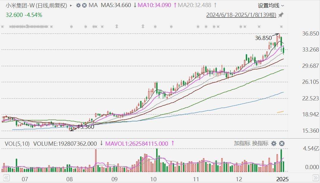 格隆汇1月8日|继昨日高位回落收跌近6%后,小米集团-W(1810.HK)今日盘中继续下跌,一度跌近6%至32.2港元,创2024年12月24日以来新低,2日累跌逾11%,较最高位(36.85港元)回调12.6%。 (责任编辑:宋政 HN002)