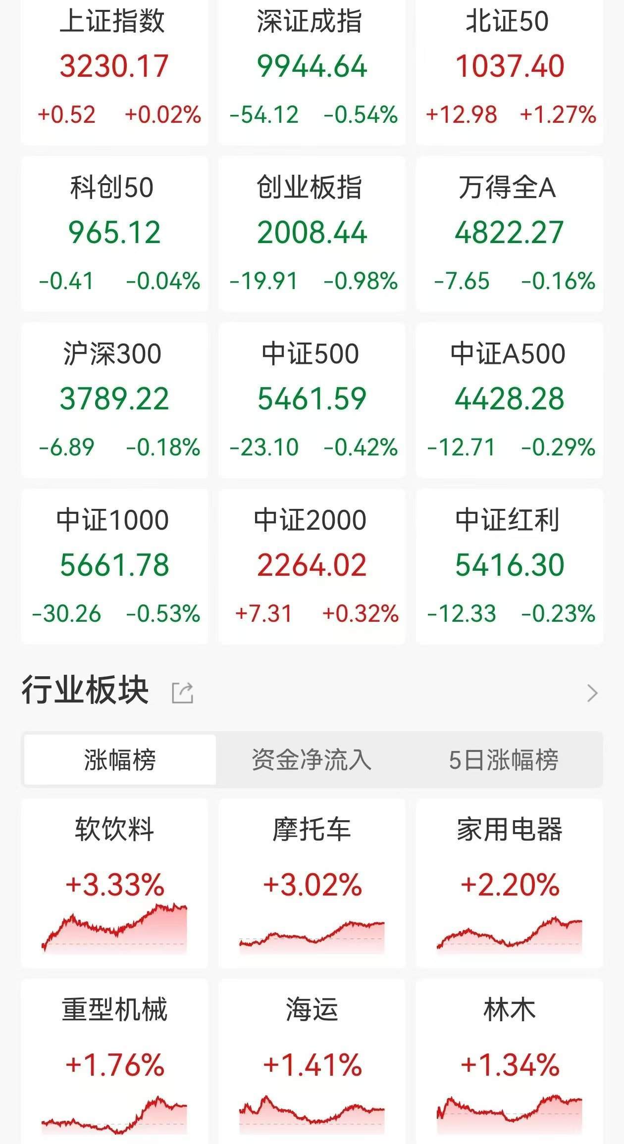 格隆汇1月8日|A股主要指数今日早盘下挫,午后V字反弹;截至收盘,沪指涨0.02%报3230点,深证成指跌0.54%,创业板指跌0.98%盘中一度跌逾3%。全天成交1.26万亿元,较前一交易日增量1978亿元,全市场近3200股下跌。 盘面上,人形机器人板块走高,兆威机电等多股涨停;脑机接口板块拉升,创新医疗(002173)逼近涨停;首发经济、商业百货板块集体冲高,广百集团等多股涨停;消费品以旧换新补贴的家电增至12类,家电板块走强,日出东方(603366)涨停;跨境电商、盲盒经济及船舶制造等板块涨幅居前。另外,转基因板块下挫,荃银高科(300087)跌超7%;CRO板块走低,*ST普利20cm跌停;小金属板块走弱,正海磁材(300224)领跌;MLCC、谈及材料及锂矿概念等跌幅居前。(格隆汇) (责任编辑:宋政 HN002)