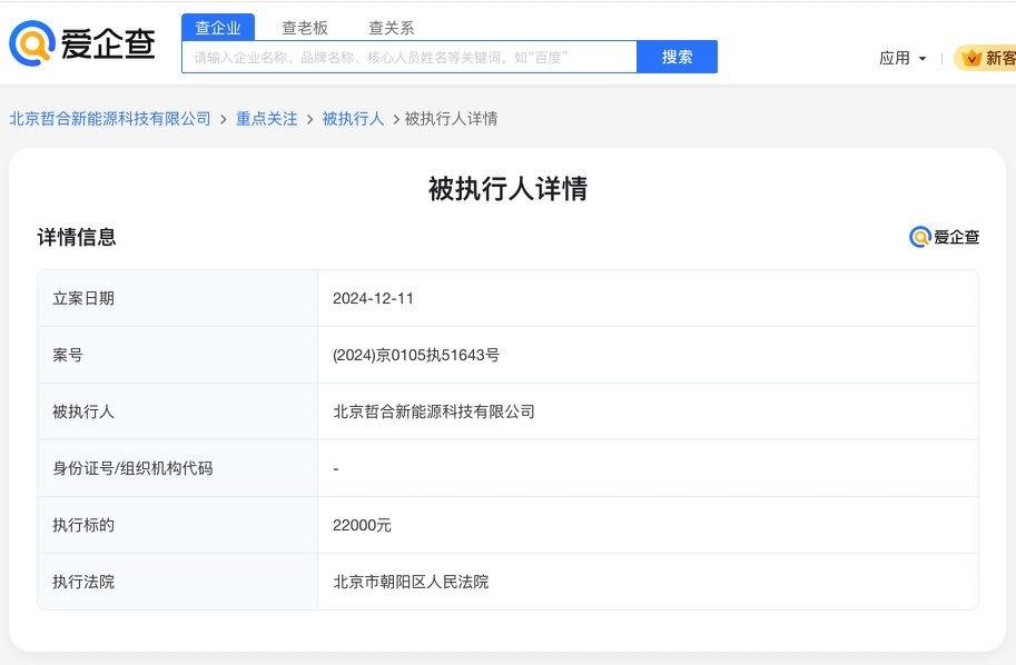 凤凰网科技讯 1月9日,近日,哪吒汽车创始人方运舟被限制高消费,涉及2024年12月11日立案执行的劳动争议一案,企业未按执行通知书指定的期间履行生效法律文书确定的给付义务,北京哲合新能源科技有限公司及法定代表人方运舟被采取限制消费措施,不得实施高消费。 限制令原文 图源:爱企查App 爱企查App显示,北京哲合新能源科技有限公司成立于2022年6月,注册资本4亿元人民币,经营范围包括互联网数据服务、信息咨询服务、汽车零配件零售、电子产品销售等,由合众新能源汽车股份有限公司全资持股。风险信息显示,2024年12月,该公司已因上述案件被强制执行2.2万元。 图源:爱企查App 图源:爱企查App (责任编辑:刘静 HZ010)