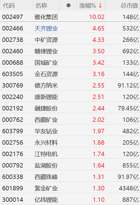 格隆汇1月13日|锂矿股逆势上涨,其中,雅化集团(002497)涨停,天齐锂业(002466)、中矿资源(002738)涨超4%,赣锋锂业(002460)、国城矿业(000688)、金石资源(603505)涨超3%,德方纳米(300769)、盛新锂能、融捷股份(002192)、西藏矿业(000762)涨超2%,华友钴业(603799)、永兴材料(002756)、江特电机(002176)、盐湖股份、西藏珠峰(600338)、紫金矿业(601899)、亿纬锂能(300014)涨超1%。 消息面上,近日,自然资源部中国地质调查局宣布,我国锂矿找矿取得一系列重大突破,锂矿资源量从全球占比6%升至16.5%,从世界第六跃至第二,重塑了全球锂资源格局。 另外,中信建投(601066)研报认为,2025年“以旧换新”政策继续推行,力度加大、范围扩大;马斯克表示特斯拉计划今年制造数千台Optimus人形机器人,未来两年每年翻10倍。稀土磁材、碳酸锂消费有望受益于“以旧换新”加码及人形机器人放量。 (责任编辑:宋政 HN002)