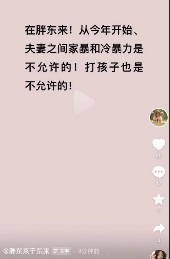 1月13日上午消息,胖东来创始人于东来今日在抖音上发文称:“在胖东来!从今年开始夫妻之间家暴和冷暴力是不允许的!打孩子也是不允许的!” 此前,胖东来还公布了员工结婚执行标准。文件中提到,胖东来员工结婚不允许收取或支付彩礼、嫁妆,以免给双方家庭造成经济压力和精神负担。同时,不允许依靠父母积蓄购置房产、购车。 (责任编辑:宋政 HN002)