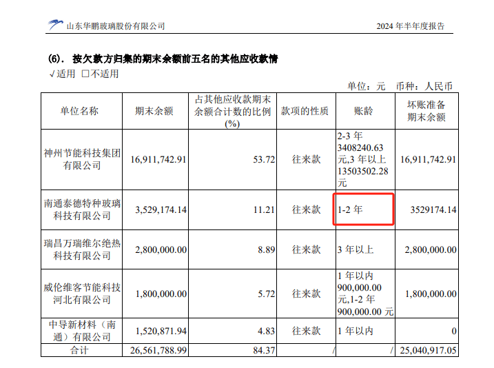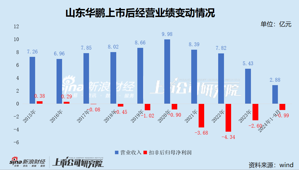 出品:上市公司研究院 作者:君 山东华鹏(维权)似乎迎来至暗时刻。 1月2日晚间,山东华鹏(603021)接连发布《关于公司银行账户被冻结的进展公告》及《关于部分债务逾期的公告》。公司目前累计逾期的债务金额合计约7.86亿元,且银行账户全部被冻结,被冻结资金合计21085.58元,前期被冻结资金259.86万元已被强制划扣。 2015年4月,山东华鹏于上交所主板首发上市,此后经营业绩坐上“过山车”,自2017年起持续陷入亏损泥潭,累计亏损金额高达8.5亿元。2024年前三季度,公司营收同比下滑28.35%,净利润虽然同比增长38.21%,但仍未实现扭亏。 累计亏损8.5亿 净资产已不足1亿 山东华鹏主营业务为研发、生产和销售玻璃器皿产品和玻璃瓶罐产品。公司玻璃器皿产品以玻璃高脚杯为主,销售渠道包括麦德龙、沃尔玛、家乐福等国际连锁超市企业;玻璃瓶罐产品直接面向酒类、食品、饮料、药品等生产企业进行销售,按用途分为酒水饮料瓶、食品调味品瓶,以及医药包装瓶等三大类十几个品种。 2015年4月,山东华鹏于上交所主板首发上市,保荐人(主承销商)为广发证券(000776)。上市首年及次年,公司扣非后归母净利润即出现下滑,2017年起更是持续陷入亏损状态。 2019年,山东华鹏以2.48亿元现金收购天元信息55%股权,跨界地理信息产业,新增地理信息测绘业务。交易对方承诺,天元信息2019―2021年的累计净利润不低于1.5亿元。业绩承诺期间,天元信息累计净利润1.36亿元,未实现业绩承诺;其中,2019年踩线达标,2021年完成率仅有36.17%。 2019―2022年,山东华鹏专利技术服务营业收入分别为7285.95万元、3.38亿元、2.58亿元和2.12亿元,占主营业务收入的比例分别为8.50%、34.50%、31.43%和28.43%;毛利率分别为52.72%、54.87%、48.87 %和21.69%,盈利能力呈现逐年下滑趋势。 为改善公司财务状况,补充营运资金,优化公司资产结构,根据公司整体战略规划和经营发展需要,山东华鹏于2022年底将所持天元信息55%股权作价2.03亿元转让给济南山元。转让完成后,公司不再从事地理信息测绘业务。 天眼查显示,天元信息已于2024年8月成为失信被执行人,被执行总金额270.31万元。 2024年前三季度,山东华鹏实现营业收入2.88亿元,较上年同期下滑28.35%,主要系甘肃子公司停产及总部瓶罐一车间窑炉大修导致产量降低,收入降低;实现扣非后归母净利润-9879.12万元,较上年同期增长34.77%,主要系部分大宗物资采购价格较去年同期有所下降,同时,公司通过加强精细化管理,改善生产工艺,控制产品单重,提高成品率,产品毛利率较上年同期上升约7个百分点。 由于仍未扭亏,截至2024年9月末,山东华鹏累计亏损金额已高达8.5亿元,净资产从1.91亿元降至0.93亿元。 需要指出的是,山东华鹏曾属国资控股,后被海科控股接盘。 2019年11月,张德华向舜和资本(现已更名为山东省绿色资本投资集团有限公司,下称“绿色投资”)协议转让所持上市公司2695万股股份(占上市公司总股本的8.42%),并放弃其上述股份转让完成后占上市公司总股本比例为20.00%(6398.96万股)的股份表决权。交易完成后,舜和资本成为公司控股股东,山东省人民政府成为公司实际控制人。 2022年10月,海科控股与张德华签署股份转让协议,约定张德华将其持有的上市公司7785.31万股股份(占上市公司总股本的24.33%)转让予海科控股,转让价款合计5.52亿元。2023年1月,上述股权转让实施完毕,公司控股股东变更为海科控股,实际控制人变更为杨晓宏。 本次交易中,海科控股或成最大输家。 本次股份转让价款合计5.52亿元,折合每股价格为7.09元。截至2025年1月10日收盘,山东华鹏报3.82元/股,海科控股所持上市公司股份对应市值为2.97亿元,浮亏约2.55亿元。其次,海科控股曾谋划对公司进行重大资产重组,将旗下赫邦化工100%股权置入上市公司,并置出现有资产。但是公司的此番重组之路走得并不顺利,其间曾两次按下“暂停键”,2024年3月以失败告终。 除控股山东华鹏外,海科控股现持有海科新源60.9%股份,为海科新源的控股股东。2023年7月,海科新源于创业板首发上市,随即便陷入“增收减利”的尴尬局面。2023年,海科新源的净利润从上年同期的2.77亿元降至0.16亿元,2024年前三季度则净亏损2.46亿,为近5年来首次出现亏损。 我们在查阅公开资料时,发现山东华鹏的其他应收款存在明显异常。2023年年度报告显示,其他应收款期末余额3061.25万元,其中应收南通泰德特种玻璃科技有限公司往来款352.92万元,账龄为2~3年,2024年半年度报告中该笔应收款的期末余额及坏账准备余额均未变动,但账龄却变为了1~2年。 图源:山东华鹏《2023年年度报告》 图源:山东华鹏《2024年半年度报告》 其次,山东华鹏于2020年12月31日董事会审议通过,对外转让“威伦维客”玻璃棉系列商标权,报告期内产生收益4245万元。上交所要求公司结合交易对方资信状况,评估后续付款是否存在违约风险。公司综合判断认为,后续存在违约风险的可能性较小。2024年半年报显示,公司应收神州节能科技集团有限公司(前述交易对方廊坊神州的母公司)往来款期末余额1691.17万元,已全额计提坏账准备。 面对山东华鹏的烂摊子,海科控股能否“脱身”? 7.86亿元债务逾期 银行账户全部被冻结 截至2024年9月,山东华鹏资产负债率高达94.53%,流动比率及速动比率分别为0.21和0.12;短期借款及一年内到期的非流动负债合计4.57亿元,另有长期应付款9.06亿元,而货币资金仅剩3386.12