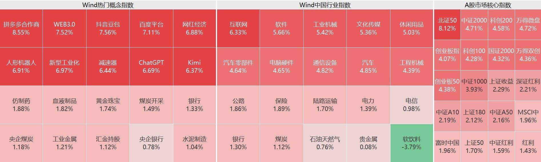 格隆汇1月14日|A股主要指数涨幅进一步扩大,沪指涨2.2%,创业板指涨4%,深证成指涨3.3%,北证50指数涨超8%。市场超5300股上涨,仅52股下跌;1股跌停,131股涨停。 港股午后涨幅继续扩大,恒生科技指数涨3.3%,恒指涨2%,国企指数涨2.2%。快手涨6%,美团、京东涨超5%,药明生物、农夫山泉、药明康德(603259)、李宁、比亚迪(002594)电子、比亚迪股份涨超4%,华润啤酒、吉利汽车、小米、腾讯涨超3%,阿里巴巴涨近2%。 (责任编辑:宋政 HN002)