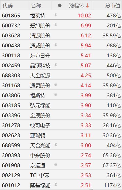 格隆汇1月15日|受相关传闻影响,A股市场光伏股集体上涨。截至半日收盘,福莱特(601865)涨停,爱旭股份、清源股份(603628)涨超6%,通威股份(600438)、东方日升(300118)、晶澳科技涨超5%,大全能源、通灵股份涨超4%,福斯特(603806)、弘元绿能、快可电子、亚玛顿(002623)、天合光能涨超3%,中来股份(300393)、京运通(601908)、隆基绿能涨超2%。 (责任编辑:宋政 HN002)