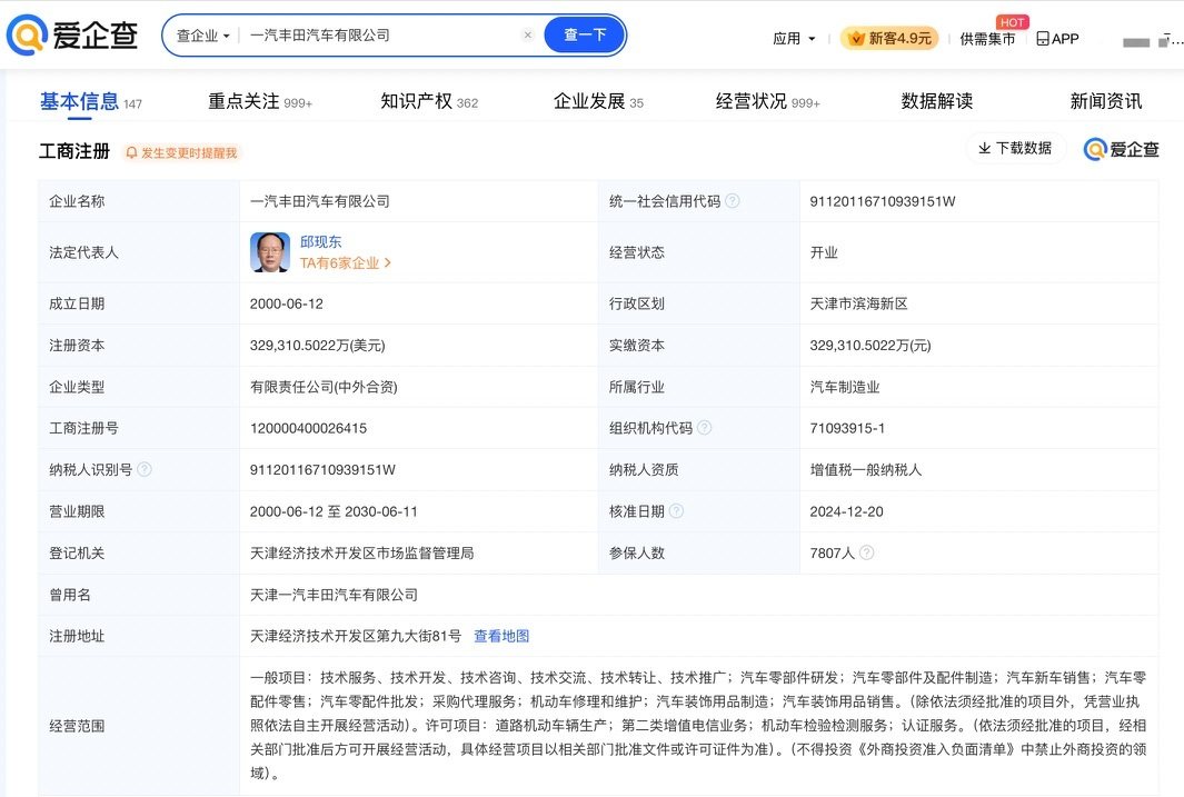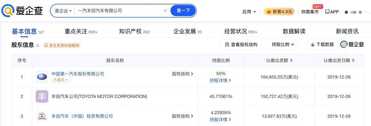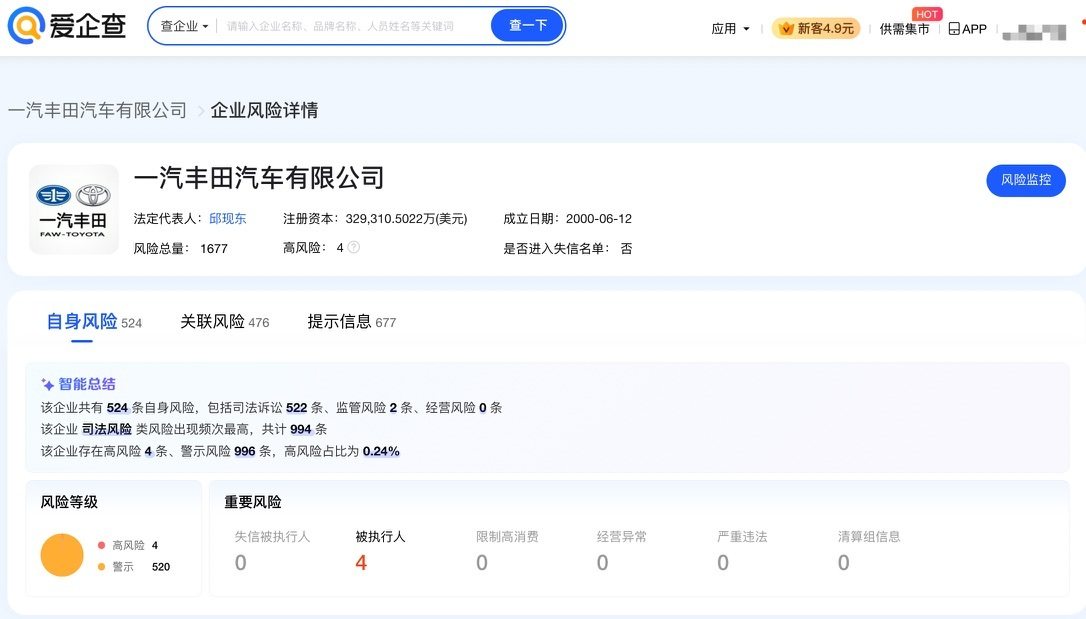 凤凰网科技讯 1月15日,据爱企查App显示,近日,一汽丰田汽车有限公司新增一条恢复执行信息,执行标的347万余元,执行法院为天津市滨海新区人民法院。 图源 爱企查 一汽丰田汽车有限公司成立于2000年6月,法定代表人为邱现东,注册资本约32.9亿美元,经营范围包括汽车零部件研发、汽车零部件及配件制造、汽车新车销售、汽车零配件零售、道路机动车辆生产、第二类增值电信业务、机动车检验检测服务等。 图源 爱企查 股东信息显示,该公司由中国第一汽车股份有限公司、丰田汽车公司、丰田汽车投资有限公司共同持股。 图源 爱企查 风险信息显示,该公司现存近5条被执行人信息,被执行总金额399万余元。 图源 爱企查 (责任编辑:刘畅 )