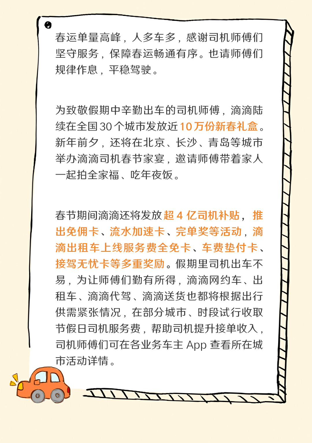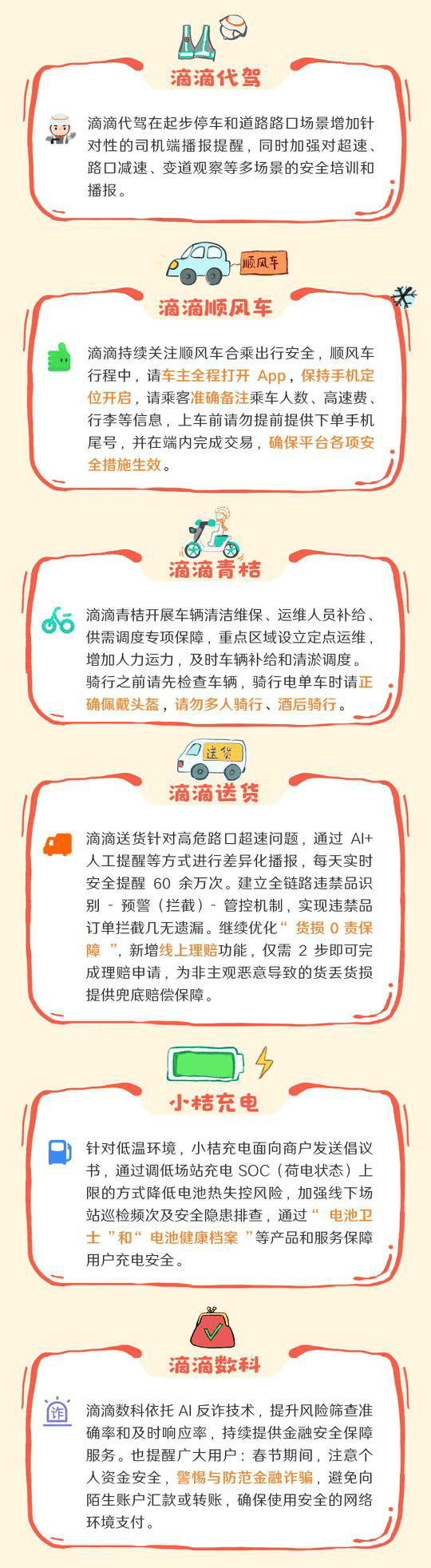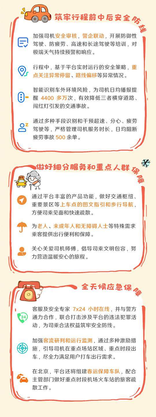 凤凰网科技讯 1月15日,从昨日起为期40天的2025年春运启动,返乡、出游等需求集中释放。 滴滴发布春运出行安全提醒,针对春运期间人流量大、恶劣天气多、供需关系复杂、客货运输风险交织等特点难点,滴滴依托平台技术能力和安全体系,加强客流分析研判,加大供需疏导和服务衔接,多环节安排7×24小时值班、全天候应急支持。 滴滴将加强司机安全审核,警企联动,开展防御性驾驶、防疲劳、高速和长途驾驶等培训,对极端天气持续预警和响应。通过平台丰富的产品功能,做好交通枢纽重要景区等上车点的图文指引和步行导航方便司乘见面和快速疏散。 (责任编辑:贺 )
