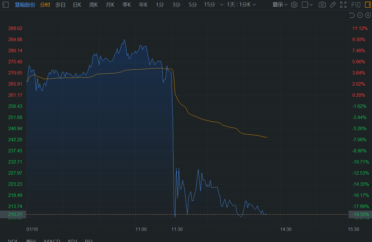 格隆汇1月16日|慧翰股份(301600.SZ)午后开盘出现闪崩行情,触及20cm跌停,跌幅居市场首位,现报210.2元,总市值147.5亿元。该股近期持续上涨,今日盘中曾创下285.05元的历史高价,12月份以来累计最大涨幅超270%。 消息上,公司是一家致 力于为智能汽车及产业物联网客户提供智能网联解决方案的科技服务商。此前公司澄清未发现近期公共传媒报道了可能或已经对公司股票交易价格产生较大影响的未公开重大信息;近期经营情况正常,内外部经营环境未发生重大变化。(格隆汇) (责任编辑:宋政 HN002)
