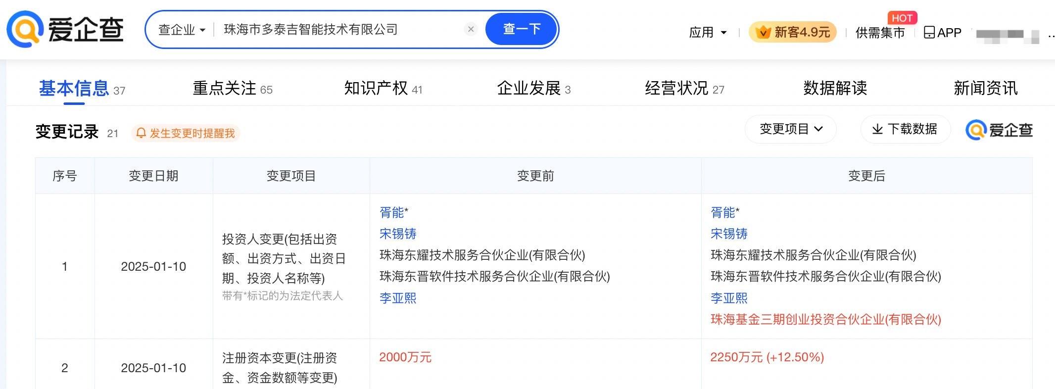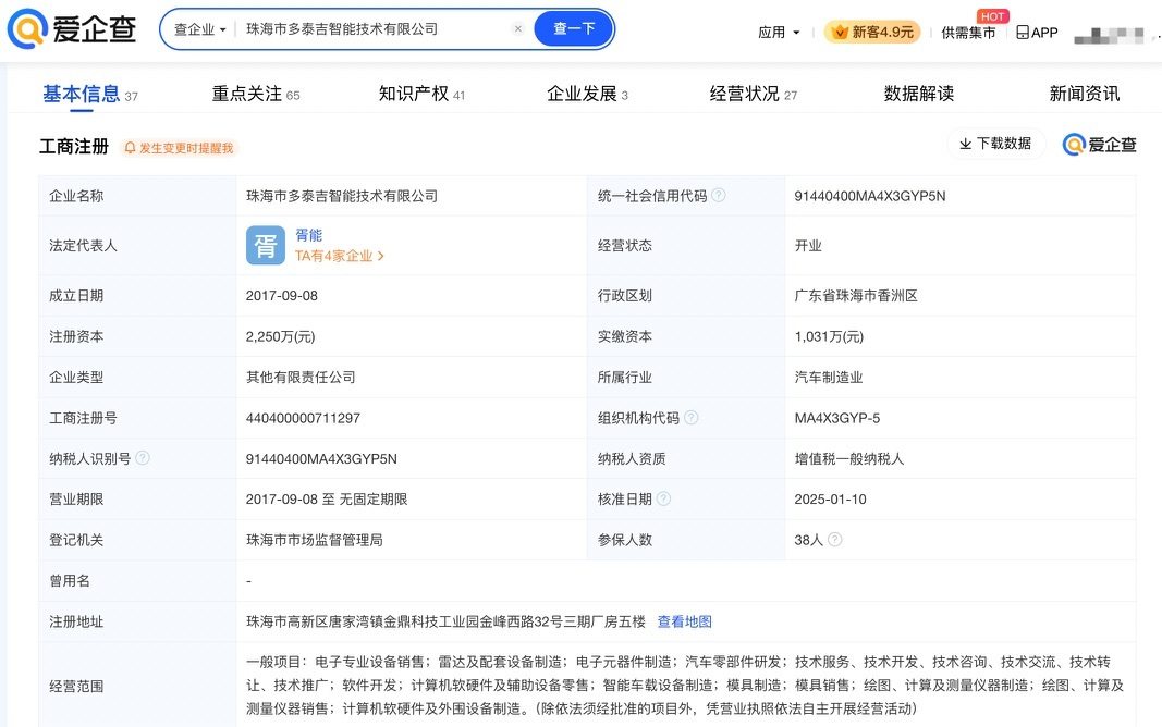 凤凰网科技讯 1月16日,爱企查App显示,近日,珠海市多泰吉智能技术有限公司发生工商变更,新增珠海格力集团有限公司旗下珠海基金三期创业投资合伙企业(有限合伙)为股东,同时注册资本由2000万元人民币增至2250万元人民币。 图源 爱企查 珠海市多泰吉智能技术有限公司成立于2017年9月,法定代表人为胥能,经营范围包括电子专业设备销售、雷达及配套设备制造、电子元器件制造、汽车零部件研发、计算机软硬件及辅助设备零售、智能车载设备制造等。官网显示,该公司是一家传感器及执行器厂商。 图源 爱企查 现由宋锡铸、胥能、珠海东耀技术服务合伙企业(有限合伙)等及上述新增股东共同持股。 图源 爱企查 (责任编辑:贺 )