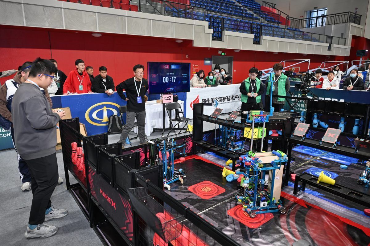 【大河财立方 记者 丁洋涛 实习生 孟琪睿 文 冉衡 摄影】1月16日,2024世界机器人大赛总决赛在郑州高新区拉开帷幕。在MakeX Challenge乘胜追机项目资格排位赛赛场,记者现场看到红方机器人团队TNT-星空彼岸正与蓝方机器人团队背水一战队进行对抗,双方团队编程设计的机器人通过不同策略组合进行防守与进攻。 据了解,该赛事为面向11~18岁中学、中职阶段的青少年,推出的强对抗类赛项。比赛双方红蓝两个联盟分别由2支战队组成,双方利用晶硅(圆饼)击打病毒炮塔(球瓶)、反转旗帜并投入中央熔炉等完成任务,得分高者获胜。 责编:史健 | 审校:陈筱娟 | 审核:李震 | 监审:万军伟 (责任编辑:郭健东 )
