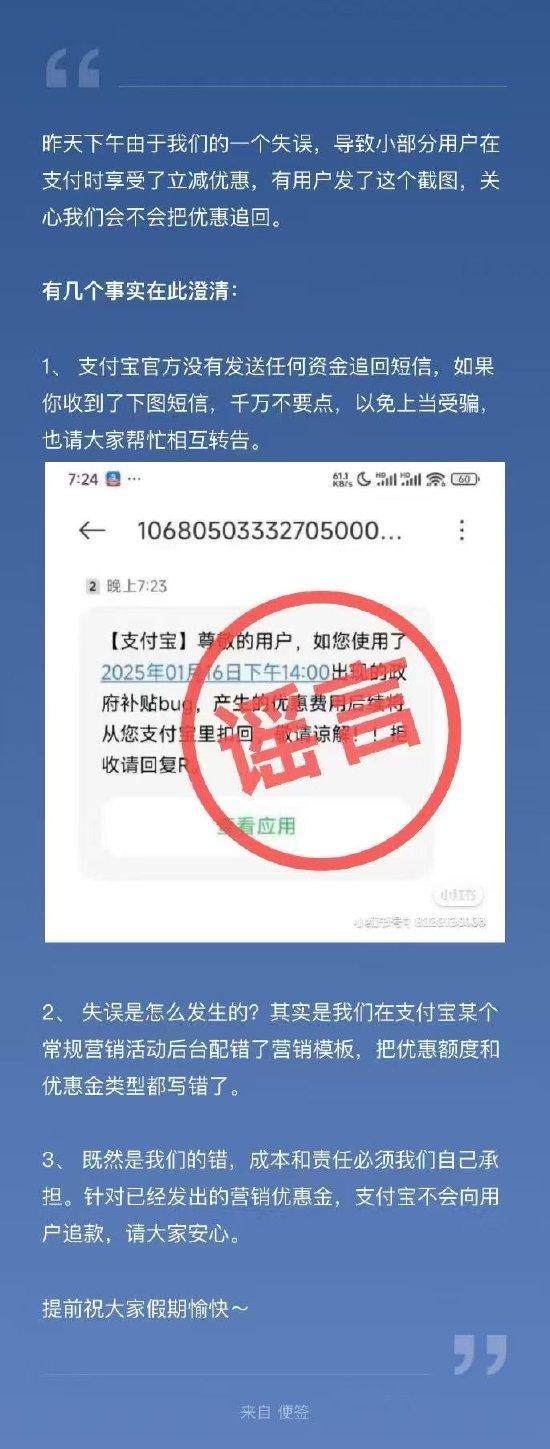 凤凰网科技讯 1月17日,今日凌晨,支付宝发文回应重大bug事故称:不会向用户追款,成本和责任支付宝自己承担。事故原因是在支付宝某个常规营销活动后台配错了营销模板,把优惠额度和优惠金类型都写错了。 1月16日,据经济观察网报道,多位支付宝用户1月16日在社交媒体发布订单支付页面截图表示,自己在下午14:40-14:45这5分钟的时间段内,通过支付宝进行个人转账等操作时,均在订单支付时提示“政府补贴”,减免优惠20%。 支付宝还提醒大家,支付宝官方没有发送任何资金追回短信,如果你收到了下图短信,千万不要点,以免上当受骗,也请大家帮忙相互转告。 (责任编辑:董萍萍 )
