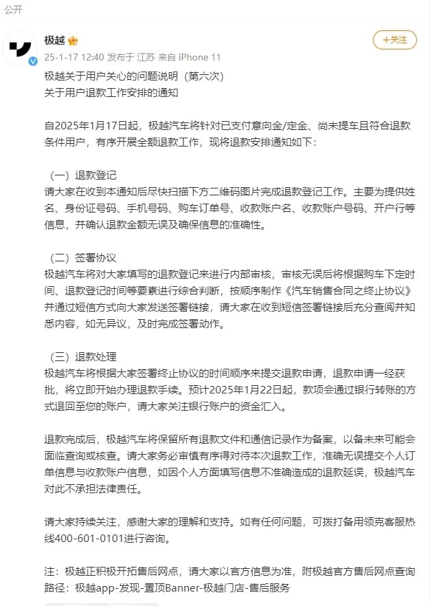 凤凰网科技讯 1月17日,极越汽车官方今日发布《关于用户退款工作安排的通知(第六次)》,针对已支付意向金/定金但尚未提车且符合退款条件的用户,正式启动全额退款工作。 退款流程主要分为三步。首先是退款登记环节,用户需在收到通知后及时扫描指定二维码,如实提供姓名、身份证号、手机号码、购车订单号、收款账户名及号码、开户行等详细信息,并仔细核对退款金额,确保信息精准无误。 随后进入签署协议阶段,极越汽车会依据用户提交的退款登记进行内部审核。审核通过后,综合购车下定时间、退款登记时间等因素,按序制作《汽车销售合同之终止协议》,并以短信形式向用户推送签署链接。用户收到链接后,应认真查阅协议内容,若无异议需尽快完成签署。 最后是退款处理阶段,极越汽车将依照用户签署终止协议的先后顺序提交退款申请。一旦获批,预计从2025年1月22日开始,退款将通过银行转账方式迅速退回至用户账户,用户需留意银行资金到账情况。 极越汽车强调,退款完成后相关文件与通信记录均会留存备案。同时提醒用户,务必严谨对待退款事宜,准确填写个人信息,若因个人信息有误导致退款延迟,公司不承担法律责任。 (责任编辑:王治强 HF013)