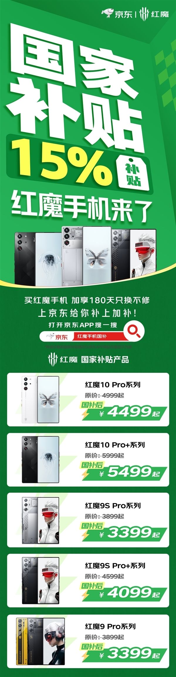 快科技1月17日消息,官方已经明确,全国各地将从1月20日开始陆续实施手机等数码产品购新补贴。 手机、平板、智能手表/手环类,单件价格低于6000元的,给予15%补贴,最高不超过500元。 红魔游戏手机今天正式宣布,1月20日起在京东购买红魔手机,享15%国家补贴,同时享受白条12期免息。 官方还公布出了在售三代机型的补贴价格: 红魔10 Pro系列原价4999元起,国补后4499元起; 红魔10 Pro+系列原价5999元起,国补后5499元起; 红魔9S Pro系列原价3899元起,国补后3399元起; 红魔9S Pro+系列原价4599元起,国补后4099元起; 红魔9 Pro系列原价3899元起,国补后3399元起。 (责任编辑:郭健东 )