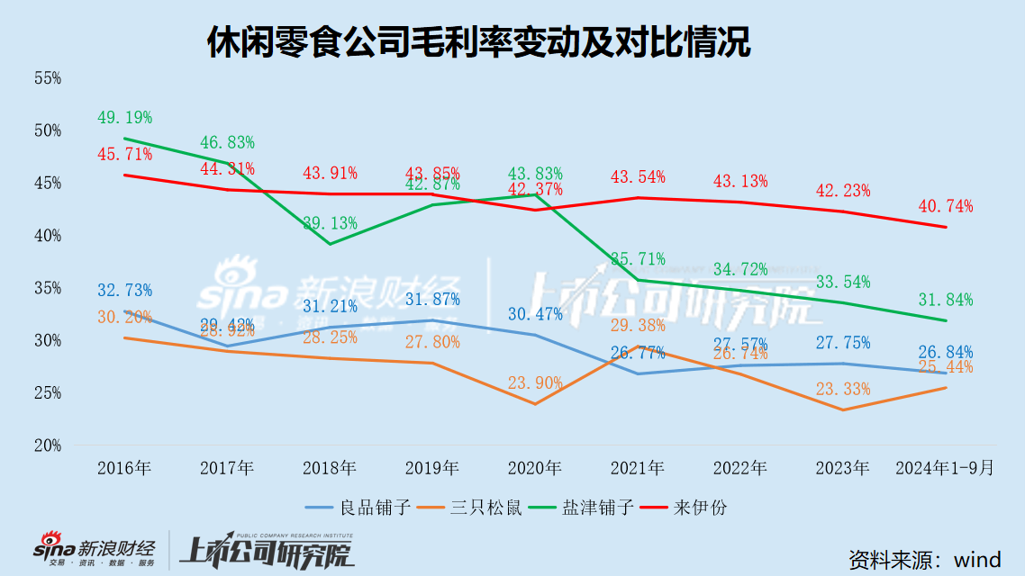 出品:上市公司研究院 作者:君 1月16日晚间,来伊份(603777)发布《2024年年度业绩预减公告》,预计2024年归母净利润为-8600万元左右,同比下滑251%左右;扣非后净利润预计为-7600万元左右,同比下滑750%左右。 公告一经发布,17日,公司股价高位退潮,盘中-10.0%跌停,报22.14元/股。此前的9-10日,13-16日,公司因踩中“小红书概念”连收6个涨停板,股价从13.66元/股迅速抬升至24.6元/股。 业绩增长失速 盈利水平垫底 来伊份2002年创立,2016年10月于上交所主板首发上市,成为“主板零食第一股”。 来伊份是一家经营自主品牌的休闲食品全渠道运营商,致力于构建国内领先的专业化休闲食品连锁经营平台。公司产品来自全球五大洲20多个国家和中国25个省市地区,主要覆盖坚果炒货、肉类零食、糕点饼干、果干蜜饯、果蔬零食、豆干小食、海味即食、糖巧果冻、膨化食品、进口食品、冲调速食、礼文化、饮品13大核心品类,1400余款商品。 2012年之后,线上渠道快速兴起,这一阶段,以三只松鼠(300783)、良品铺子、盐津铺子(002847)为代表的企业借助线上渠道红利,以轻资产的经营方式迅速吸引资本,规模体量实现了快速提升,2016-2023年的营业收入复合增长率分别达16.88%、12.44%和27.65%。特别是,盐津铺子2019-2023年的营收规模从13.99亿元飙升至41.15亿元,短短5年时间里几乎翻了三倍。 然而,来伊份却仍专注于线下门店,未及时抓住线上销售模式的变革方向与行业风口,营业收入复合增长率仅为3.05%,成了休闲零食行业的“吊车尾”。上市首年,来伊份线上业务收入约为2.4亿元,占营业收入的比例仅7.42%左右;同期,三只松鼠、良品铺子线上业务占比分别为96.82%、33.69%,来伊份线上渠道的开拓效率已远远落后。甚至于2023年,来伊份的电商收入占营业总收入的比重也还是只有8.26%,门店零售的收入贡献率继续超六成。 2023年,受上海区域特定渠道团购业务收入减少的影响,以及部分电商业务战略调优后业务规模下降的影响,来伊份实现营业收入39.77亿元,同比减少9.25%,系上市以来首次下滑;盐津铺子的营业收入则同比大幅增长42.22%,实现后来居上,营收规模首次超过来伊份。 2024年1-9月,来伊份实现营业收入25.23亿元,较上年同期下滑15.96%;盐津铺子、三只松鼠的营业收入分别同比增长28.49%和56.46%;良品铺子的营业收入虽也下滑,但降幅仅是公司的一半左右,营收规模仍是公司的两倍。 利润端,来伊份的线下门店以高端零食集合店为主,主要采取渠道品牌模式,采用代工模式,用强渠道背书提升毛利率水平。因此,与其他休闲零食商相比,来伊份的销售毛利率极高,且受行业“内卷”影响较小。2024年1-9月,来伊份的毛利率虽处于历史较低水平,但仍达40.74%,高出盐津铺子10个百分点,高出三只松鼠、良品铺子约15个百分点。 与线上起家的、良品铺子不同,来伊份销售渠道仍以传统线下门店为主,且由于需维持品牌形象,门店装修要求严格,故成本也相对较高。2021年至2024年1-9月(下称“报告期”),休闲零食行业的期间费用率均值分别为26.19%、24.20%、21.94%和21.69%,而来伊份的费用率则高达44.61%、40.60%、41.48%和43.27%,是同行的两倍多,严重侵蚀了利润空间。 也因此,来伊份陷入“高毛利率 低净利率”的尴尬困境。报告期内,来伊份的销售毛利率均高于40%,但净利率仅为0.74%、2.33%、1.56%和-1.77%,在休闲零食行业中处于垫底水平;同期,可比公司均值分别为4.67%、5.25%、5.93%和5.97%。 三只松鼠、良品铺子、盐津铺子自上市以来的净利润从未亏损,而来伊份2020年净亏损6519.54万元,2024年预计净亏损8600万元左右。截至2024年9月末,来伊份的未分配利润为4.59亿元,三只松鼠、良品铺子、盐津铺子分别为17.26亿元、11.95亿元和9.55亿元,分别是来伊份的3.76倍、2.6倍和2.08倍。 有意思的是,相较三只松鼠、良品铺子、盐津铺子,来伊份最早成立也最早上市。 零食渠道迭代升级 行业竞争格局重塑 品类属性和中国区域口味差异决定了零食受渠道影响高于品牌本身,过去四次渠道变革中,抓住机会的公司都获得了快速的发展。供给方式多元化助推了休闲零食行业供过于求,业内新增企业数量增速远超行业规模增速,竞争加剧下公司对渠道带来的增量更为敏感。 2018-2022年中国休闲食品相关企业注册量从2.38万家增加到13.41万家,复合增速54%,同期中国休闲食品行业市场规模从7147亿元增加到8437亿元,复合增速4%,行业内新增企业数量增速远超行业规模增速,更多食品加工企业或者运营公司可以通过新渠道触达消费人群,打破传统线下分销体系的壁垒,零食行业供给失衡,竞争加剧。在此背景下,传统线下渠道和线上电商(淘系、京东、抖快)的营收占比发生了剧烈变化,新渠道的占比大幅增加。 近一轮的渠道变化中,量贩渠道和抖音渠道是新增长极。尤其是零食量贩店近年来发展迅猛,逐渐分薄蚕食休闲零食品牌线下门店的优势。 零食行业变革的底层需求是降本、提率、增收,以零食很忙、好想来等为代表的零食量贩连锁门店,除了压缩渠道层级,还通过规范化、数字化门店管理提升门店效率、优化供应链、高周转,实现高性价比。同时,对产品矩阵进行更多元和标准化管理,采取“白牌+腰肩部产品+引流品”的模式,满足消费者“多好快省”的消费诉求。 零食量贩头部品牌2023年开始兼并收购,两强格局初步形成。行业内量贩零食门店已经近3万家,鸣鸣很忙和万辰集团分别