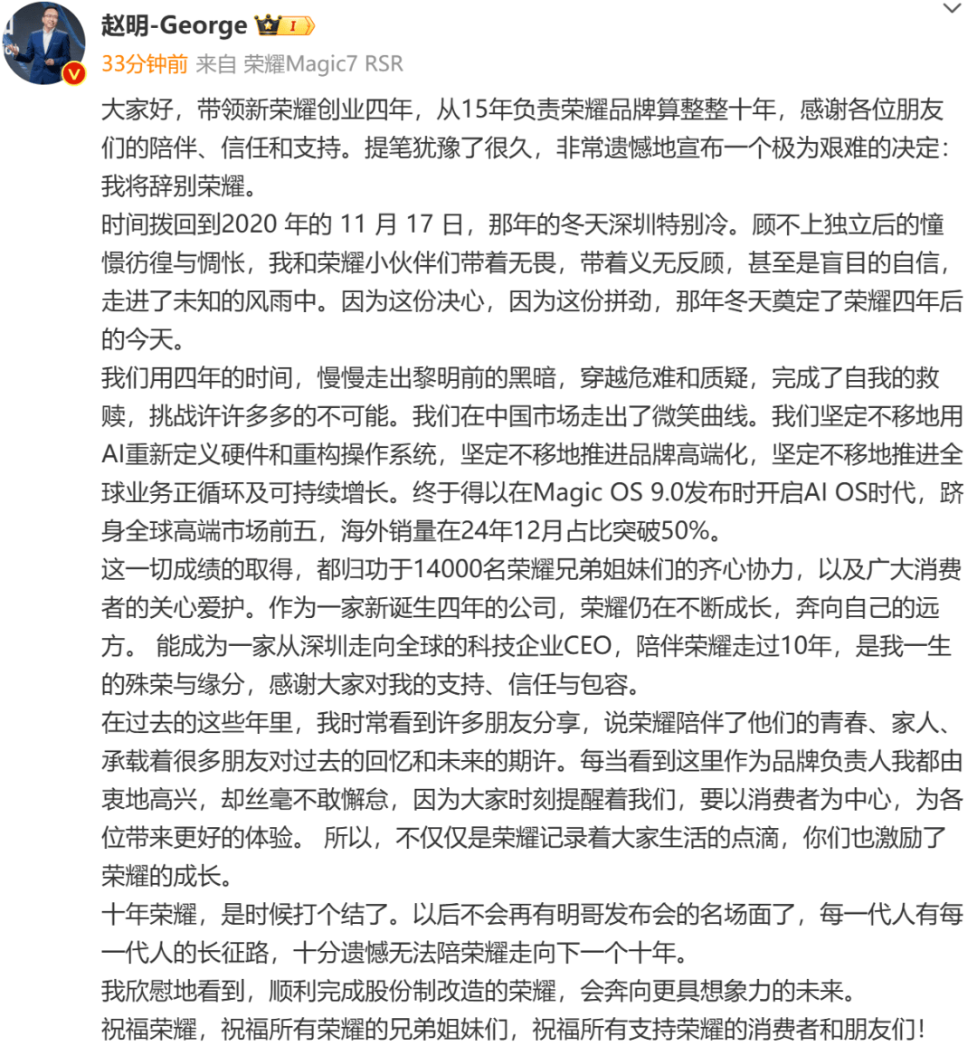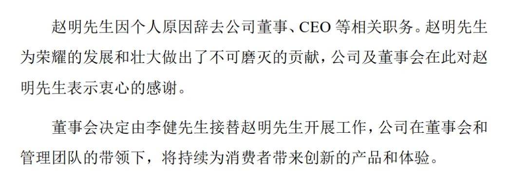 1月17日,荣耀高层“换帅”一事落定。荣耀终端股份有限公司内网发布公告称:赵明因个人原因辞去公司董事、CEO等相关职务,董事会决定由李健接替赵明开展工作。 据悉,李健曾被称为前华为悍将。他于2001年加入华为,2017年起进入华为监事会,在战略管理和全球化作战等方面拥有丰富的经验,并且李健也参与过华为公司重大改革和战略制定,在诸多重要战役中有突出的领导表现。2021年李健加入新荣耀,先后任管理团队核心成员、副董事长、董事、人力资源部总裁等职务。 另外,1月17日,荣耀CEO赵明在内网发文称,将离开荣耀。“选择放手和离开荣耀,是我人生当中做出的一个最艰难的决定。过去10年,荣耀几乎就是我的生活的全部。(独立)4年来,有超过一万人加入荣耀,我们汇集了大量的优秀人才,2024年公司完成了利润、奖金预算目标。” 对于未来,赵明称,目前规划就是修整和学习。“我毕业就进入华为,工作27年了,超过20年都是孤身在外,这种长时间、高强度的工作在体检表上留下了一行行的各种超标……未来一段时间我会调整、修复我不堪重负的身体,陪伴家人,读读书,完善自己。” 记者|王晶 |每日经济新闻 nbdnews 原创文章| 未经许可禁止转载、摘编、复制及镜像等使用 (责任编辑:王治强 HF013)