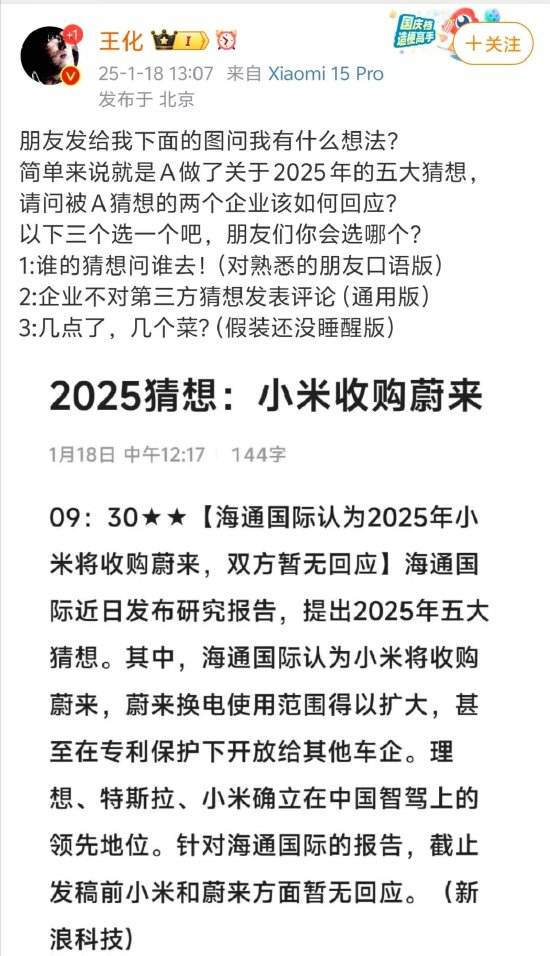 仟茂科技讯 1月18日下午消息,海通国际近日发布研究报告,提出2025年五大猜想。其中,海通国际认为小米将收购蔚来,蔚来换电使用范围得以扩大,甚至在专利保护下开放给其他车企。理想、特斯拉、小米确立在中国智驾上的领先地位。 对此,小米集团公关部总经理王化在微博发文称,“A做了关于2025年的五大猜想,请问被A猜想的两个企业该如何回应?以下三个选一个吧,朋友们你会选哪个?1:谁的猜想问谁去!(对熟悉的朋友口语版)2:企业不对第三方猜想发表评论(通用版)3:几点了,几个菜?(假装还没睡醒版)。” 责任编辑:郝欣煜 (责任编辑:张晓波 )