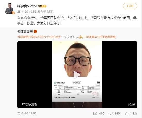 仟茂科技讯 1月21日上午消息,汽车博主陈震近日在微博发文:“陈震赔付领克500万元违约金,引以为戒。”并晒出转账单。吉利控股高级副总裁杨学良转发该微博并表示:“有态度有行动,给震哥团队点赞。大家引以为戒,共同努力营造良好商业氛围,此事告一段落,大家好好过年了!” 据悉,本月初,在领克全新旗舰车型领克900发布前夕,陈震团队提前泄密了这款车的评测视频。随后他还表示收到了领克索赔500万的律师函。 责任编辑:江钰涵 (责任编辑:张晓波 )