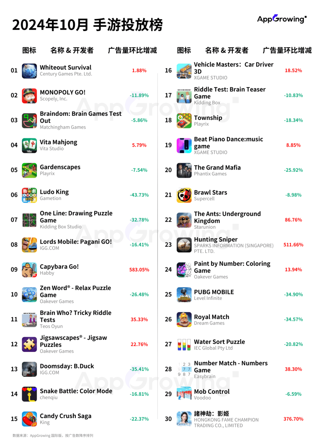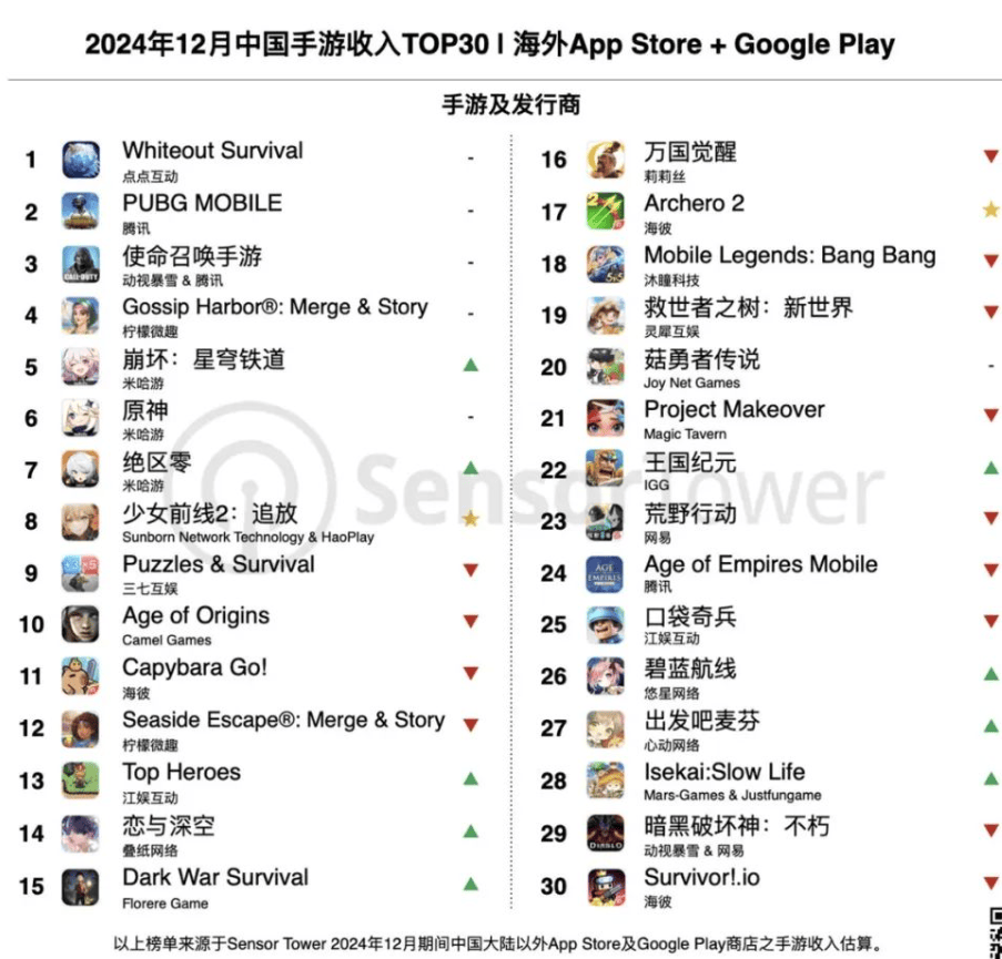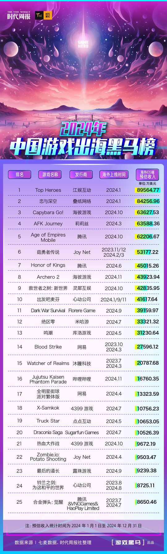 Roguelike类RPG游戏赛道再迎出海黑马! 近日,第三方机构Sensor Tower发布了2024年12月中国手游产品在海外市场收入及下载量排行榜,海彼游戏旗下《Capybara Go!(冒险者日记)》《Archero 2(弓箭传说2)》两款手游跻身中国出海手游收入榜Top20,双双成为海彼游戏旗下爆款新作。 图源:Sensor Tower 这其中,《Capybara Go!》是去年10月在全球市场上线的一款Roguelike冒险RPG新游,上线首日即登顶海外多个市场Google Play下载总榜,空降10月Sensor Tower出海手游收入增长榜季军,并于11月登顶Sensor Tower增长榜榜首;《Archero 2》则是去年11月在海外/境外上线的Roguelike动作RPG新游,上线首日即登顶韩国Google Play下载总榜和中国台湾App Store下载总榜,并空降11月Sensor Tower出海手游收入增长榜第4名。 图源:《冒险者日记》官方公众号 据海彼游戏官网显示,海彼游戏由CEO王嗣恩于2018年1月在新加坡创立,是知名的全球游戏发行商,发行的游戏包括《弹壳特攻队》《弓箭传说》《光之境》《企鹅岛》等,主要合作游戏开发商有Gorilla Games(猩球游戏)等。 1月13日,就《Capybara Go!》《Archero 2》海外市场表现、海彼游戏游戏产品出海布局和未来发展规划等问题,时代周报记者向海彼游戏发去采访提纲,截至发稿未获回复。 互联网产业分析师张书乐告诉时代周报记者,早前主流手游都太过程式化,让玩家在机械式的打怪、升级和通关中很容易出现审美疲劳。而肉鸽(即Roguelike)类游戏在地图、打怪上的大随机,以及殒命重来的游戏战术要求,则加大了偶然性,形成一种局局新的游戏体验,这让玩家有了更多获得感,而成为当下众多游戏的选择。 “用此来突破,二三线游戏公司可以快速进入到游戏市场中,但由于此类打法的技术门槛并不高,真正要形成和众多肉鸽游戏的差异化,避免玩家在无尽的肉鸽中出现再次疲劳,也特别考验游戏研运的创新能力。”张书乐补充道。 去年预估收入超10亿美元 《Capybara Go!》《Archero 2》的海外爆火绝非偶然。在两款游戏海外市场上线前,海彼游戏已经在海外主要市场进行了大规模的广告投放。 据AppGrowing国际版数据监测,海彼游戏新作《Capybara Go!》去年10月上线首月广告量环比暴增584.05%,空降2024年10月手游投放榜第9名。 图源:AppGrowing国际版 AppGrowing国际版监测数据显示,《Capybara Go!》从2024年9月下旬起便开始大规模买量,单日广告投放量一度超过6000组,同时还开启预约并登顶10月App Store和Google Play双端游戏预约榜榜首,预约中地区达到12个。 图源:AppGrowing国际版 另一边,《Archero 2》在去年11月上线之初也依靠买量打开海外市场,但据AppGrowing国际版监测数据,从旗下产品投放占比分布来看,去年11月海彼游戏的主推产品还是《Capybara Go!》。 AppGrowing国际版监测数据显示,《Archero 2》在预约期只进行了小规模的买量投放,从2024年11月中下旬起才开始大规模买量,单日广告投放量一度超过3000组,同时还位列11月App Store和Google Play双端游戏预约榜前4位,预约中地区达到14个。 图源:AppGrowing国际版 随着双端买量的增长,《Capybara Go!》去年10月快速凭借玩家对高人气动物水豚卡皮巴拉的喜爱、可爱的卡通风格,以及融合放置RPG、文字冒险和Roguelike等玩法,上线一周内日流水已经超越旗下热门游戏《Survivor!.io》。此外,《Capybara Go!》还成为了2024年10月Sensor Tower出海手游收入增长榜季军,并于2024年11月登顶Sensor Tower增长榜榜首、跻身出海手游收入榜第9位。 而《Archero 2》则得益于前作《弓箭传说》的市场吸引力,凭借相比前作更加精美细腻的美术风格和更加新颖的游戏场景和关卡设计,以及更加丰富的Roguelike技能,成为2024年11月韩国和中国台港澳市场收入最高的动作手游。《Archero 2》空降了2024年11月Sensor Tower出海手游收入增长榜第4名,并于2024年12月跻身Sensor Tower出海手游收入榜第17位。 据时代周报发布的《2024年中国游戏出海黑马榜》,《Capybara Go!》《Archero 2》两款上线不久的新游“杀入”前十,分别位列第3位和第8位,2024年海外iOS端预估收入分别达到6.36亿美元(约为44.54亿元)、4.39亿美元(约为30.75亿元),合计达到10.75亿美元(约为75.29亿元)。 创业7年爆款不断 作为《Capybara Go!》《Archero 2》的发行商,海彼游戏有什么来头? 天眼查显示,海彼游戏境内实体上海海彼网络科技有限公司成立于2018年3月30日,注册资本100万元,法定代表人和实际控制人均为王嗣恩,已完成由真格基金投的650万美元A轮融资。 创业7年来,王嗣恩带领下的海彼游戏现象级产品接连不断。 王嗣恩曾担任金山网络产品总监,并于2013年创立猎豹移动广州研发中心,2014年带领团队从广州来到北京开拓猎豹移动游戏业务,曾是前猎豹移动游戏业务负责人,于2015年7月打造出《钢琴块2》,后于2017年离开猎豹游戏、2018年1月创立海彼游戏。 时代周报记者注意到,海彼游戏对外宣称,自己是一家全球游戏发行商,主要寻找杰出的游戏制作人和有创意的游戏团队,并帮助他们将有创意且有趣的游戏作品在全球推广发行。但从海彼游戏主要合作游戏开发商和历年发行爆款游戏来看,海彼网络的全球代理发行更偏向于赚口碑,实质上“赚钱”的项目主要依靠Gorilla Games研发。 据海彼游戏官网,其上两款全球爆款《弓箭传说》《弹壳特攻队(Survivor!.io)》均来由Gorilla Games研发。而此次爆火的《Capybara Go!》《Archero 2》研发工作室也正是Gorilla Games。 据脉脉显示,Gorilla Games创立于20